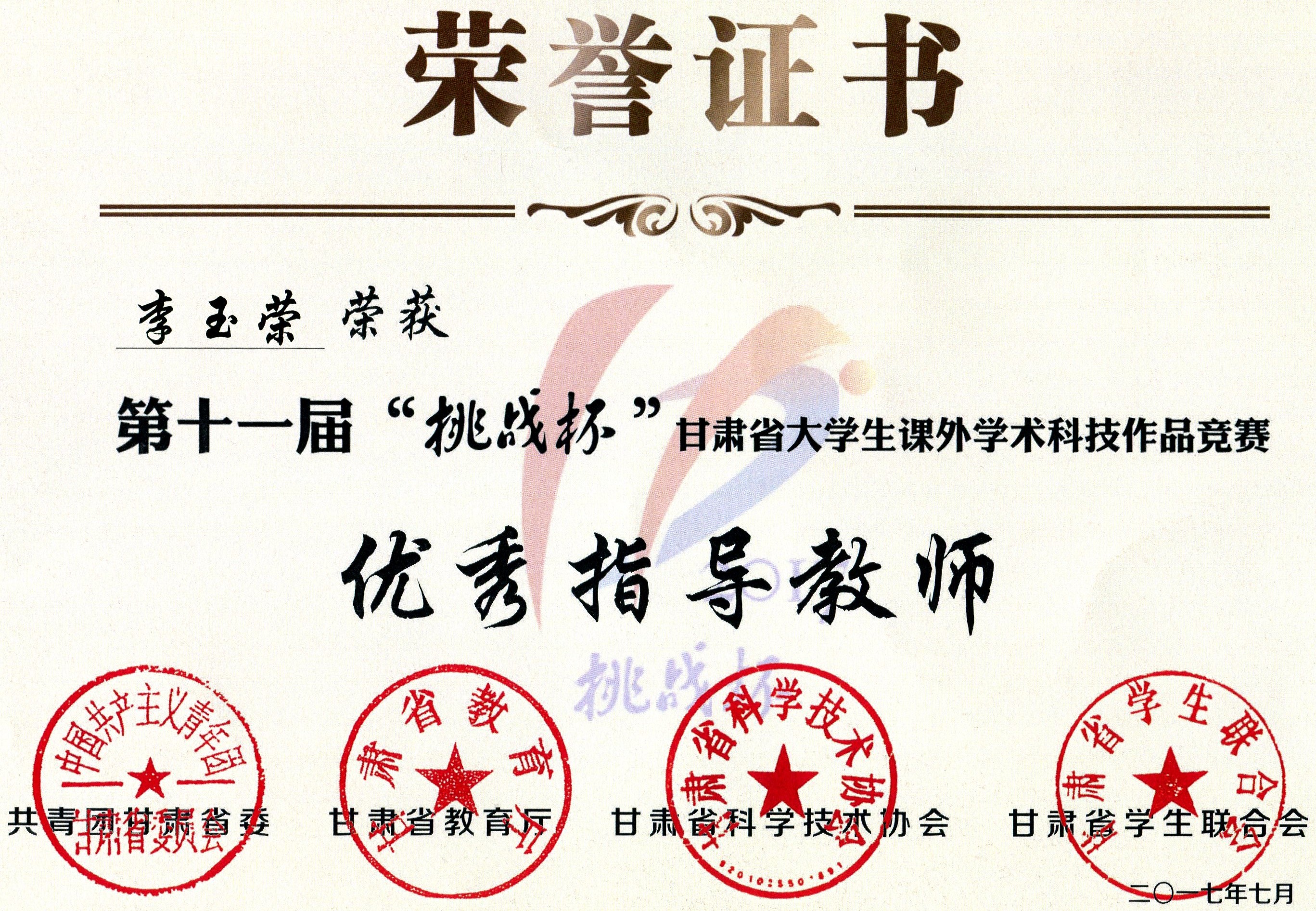 第十一屆“挑戰(zhàn)杯”甘肅省大學(xué)生課外學(xué)術(shù)科技作品競(jìng)賽“優(yōu)秀指導(dǎo)教師”