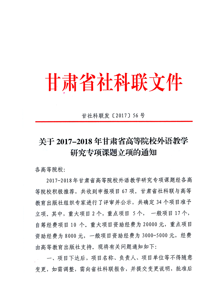 轉(zhuǎn)發(fā)甘肅省社科聯(lián)“關(guān)于2017-2018年甘肅省高等院校外語教學(xué)研究專項(xiàng)課題立項(xiàng)的通知”