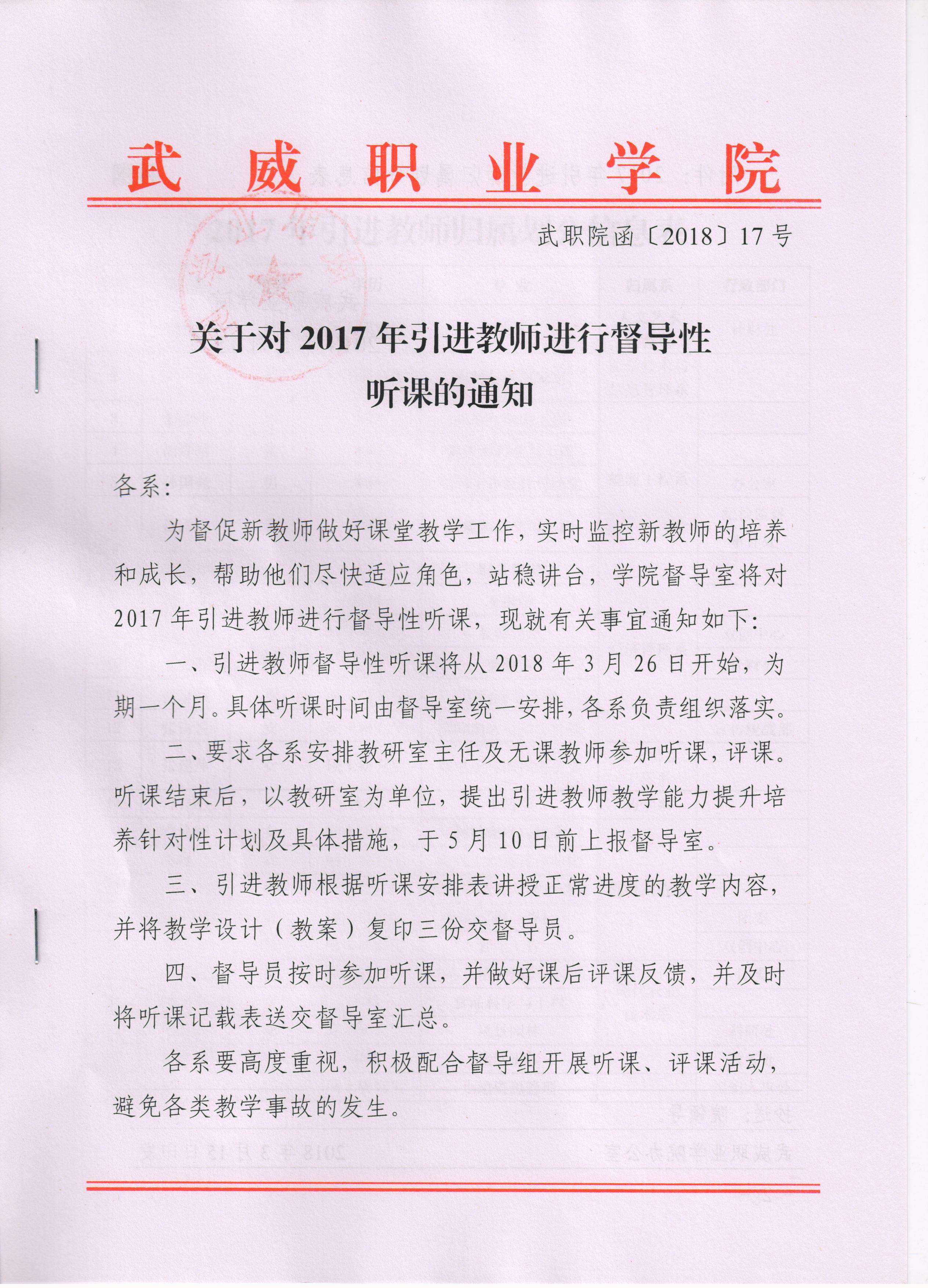 關(guān)于對(duì)2017年引進(jìn)教師進(jìn)行督導(dǎo)性聽(tīng)課的通知