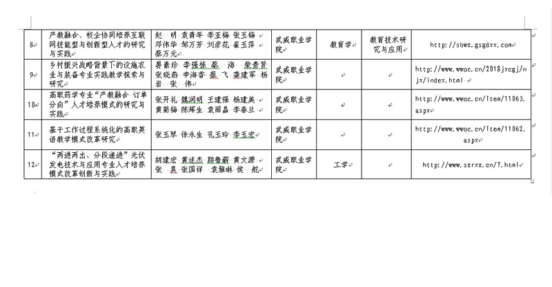 根據(jù)甘肅省人力資源和社會(huì)保障廳、甘肅省教育廳《關(guān)于開(kāi)展2018年甘肅省職業(yè)教育教學(xué)成果獎(jiǎng)評(píng)選表彰工作的通知》精神,經(jīng)個(gè)人申報(bào),學(xué)院審核,決定擬推薦以下所提交紙質(zhì)材料、電子材料、申報(bào)網(wǎng)站等符合申報(bào)要求的12項(xiàng)教學(xué)成果參評(píng)2018年甘肅省職業(yè)教育教學(xué)成果獎(jiǎng),現(xiàn)予以公示。