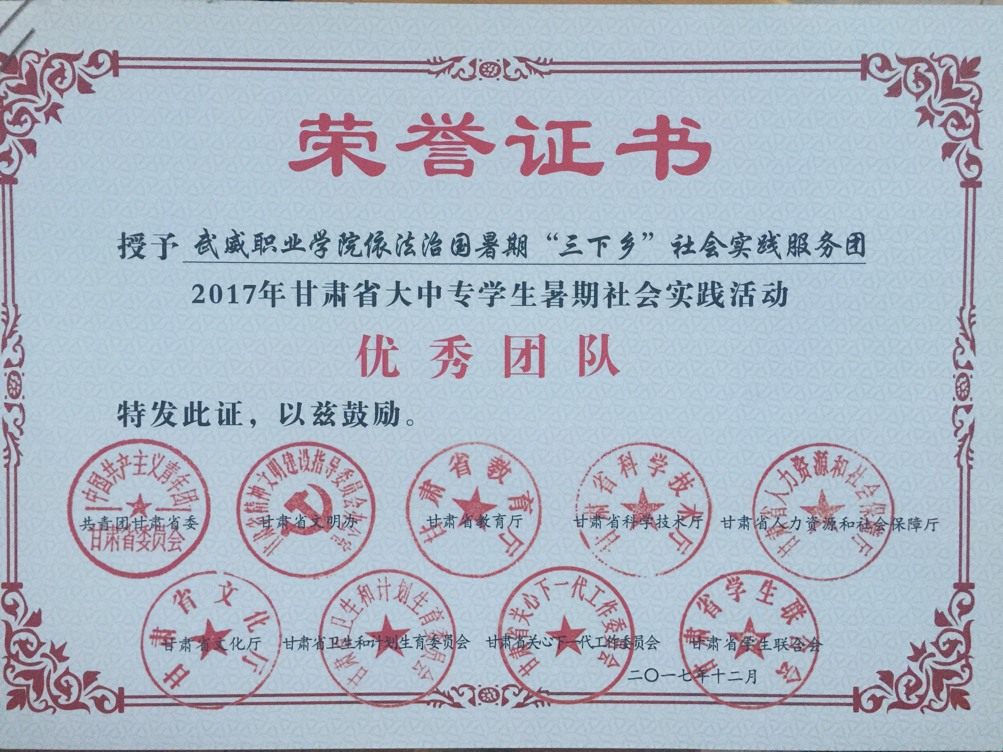 2017年甘肅省大中專學生暑期社會實踐活動“優(yōu)秀團隊”--依法治國暑期“三下鄉(xiāng)”社會實踐服務團