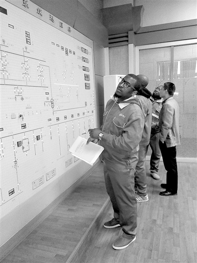 圖為該校2012級赤道幾內(nèi)亞留學生在故縣水利樞紐電站中控室進行運行實習。