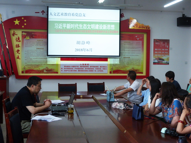 ?? 為深入學習習近平新時代中國特色社會主義思想,人文藝術教育系黨總支于6月13日下午在勵勤樓209黨員活動室開展書記講黨課活動。黨課由系黨總支書記胡靜峰主講,題目為《習近平新時代生態(tài)文明建設新思想》,系全體黨員參加了此次活動。