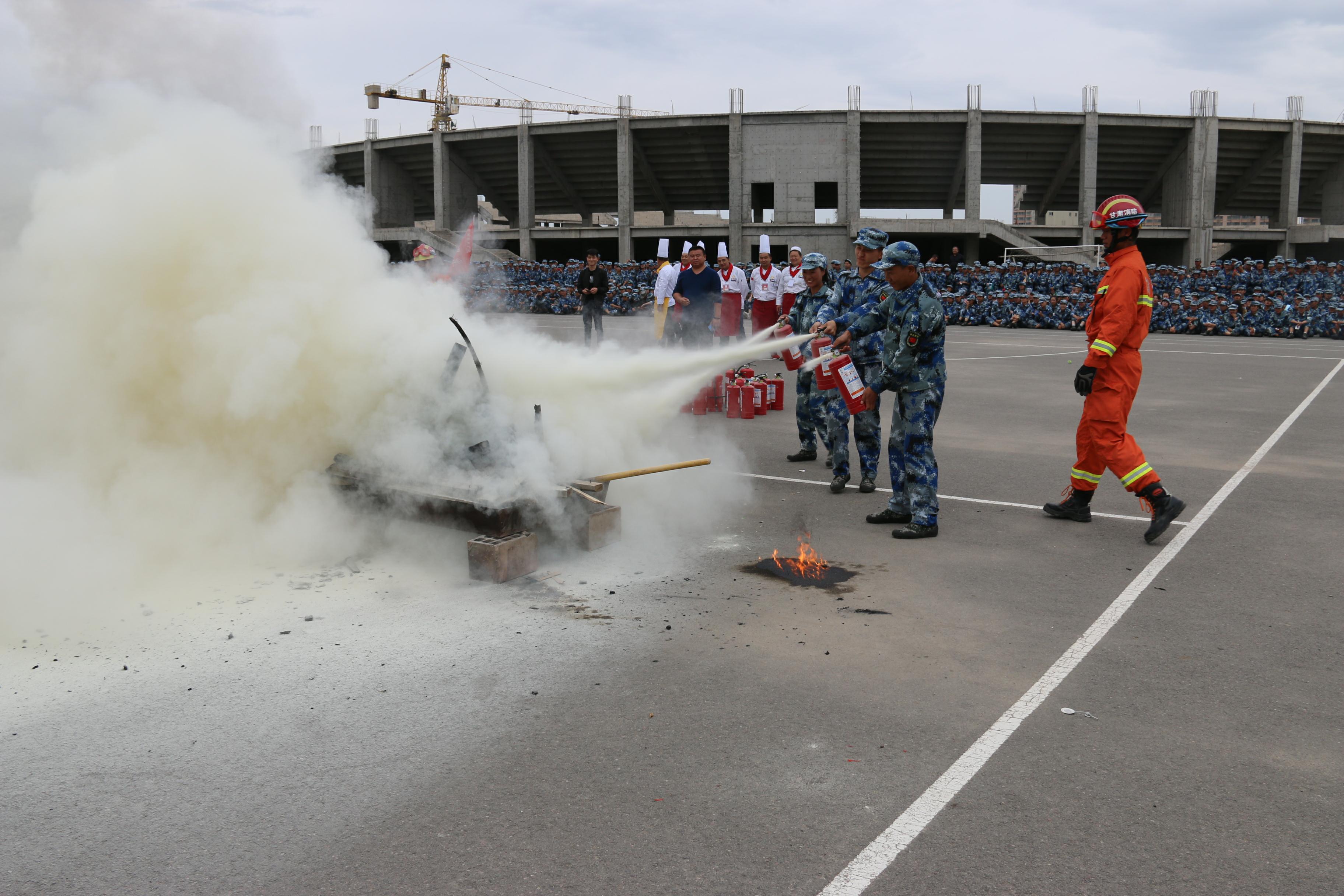 隨后,所有參演學生整隊到操場參加了滅火演練。在消防官兵的講解和和示范下,同學們體驗了處置著火液化氣瓶、干粉滅火器滅火、穿消防救生衣、通過模擬煙室等操作。