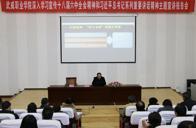 根據(jù)省委和全省宣傳工作會議關于在全省組織開展深入學習宣傳十八屆五中全會精神和習近平總書記系列重要講話精神主題宣講活動的通知要求,為向全院黨員干部和師生宣傳好、解讀好十八屆五中、六中全會精神和習近平總書記系列重要講話的實質(zhì)內(nèi)涵和深遠意義,將全會精神和總書記系列重要講話精神作為指導和推動學院各項事業(yè)快速發(fā)展的科學理論和強大動力。10月29日上午,“武威職業(yè)學院深入學習宣傳十八屆五中、六中全會精神和習近平總書記系列重要講話精神主題宣講報告會”在學院尚德樓正德廳舉行。會議邀請省委講師團成員、蘭州大學馬克思主義學院博士生導師王學儉教授蒞臨學院,作題為“四個全面”戰(zhàn)略布局解讀的宣講報告。學院黨委副書記趙明,副院長王永緒、潘玉華、田迎春,全體中層干部,各部門師生代表共計260余人參加宣講報告會。報告會由田迎春主持。