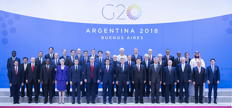 當?shù)貢r間11月30日,二十國集團領(lǐng)導人第十三次峰會在阿根廷布宜諾斯艾利斯舉行。國家主席習近平出席第一階段會議并發(fā)表題為《登高望遠,牢牢把握世界經(jīng)濟正確方向》的重要講話。這是習近平同其他與會領(lǐng)導人合影。 新華社記者 李濤 攝