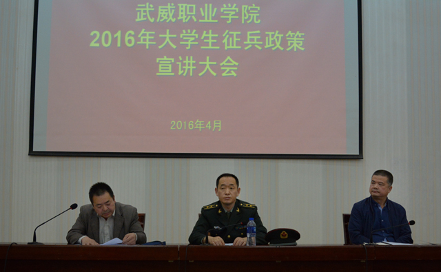 為支持國(guó)防建設(shè),鼓勵(lì)大學(xué)生參軍入伍保家衛(wèi)國(guó),學(xué)院于4月14日下午在尚德樓正德廳召開(kāi)了2016年大學(xué)生應(yīng)征入伍政策宣講暨動(dòng)員大會(huì)。學(xué)生工作處負(fù)責(zé)人王守云主持會(huì)議,涼州區(qū)人民武裝部政治工作科科長(zhǎng)趙輝泉、涼州區(qū)西關(guān)街政法書(shū)記趙光慶到場(chǎng)宣講。學(xué)院280多名師生參加了宣講大會(huì)。