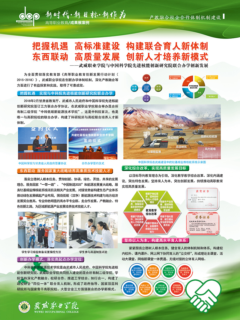 12月8日至9日,學院黨委書記、院長趙明教授、副院長翟存祥教授帶隊參加了在福建福州召開的全國高職高專校長聯席會議2018年年會。學院自主研發(fā)的“光伏組件智能清潔裝置”榮獲高職院校技術研發(fā)與應用成果 “優(yōu)秀成果獎”(全國僅36所高職院校獲此殊榮,甘肅省僅2所),“學院與中科院先進核能創(chuàng)新研究院聯合辦學創(chuàng)新發(fā)展”案例入選教育成果案例展。