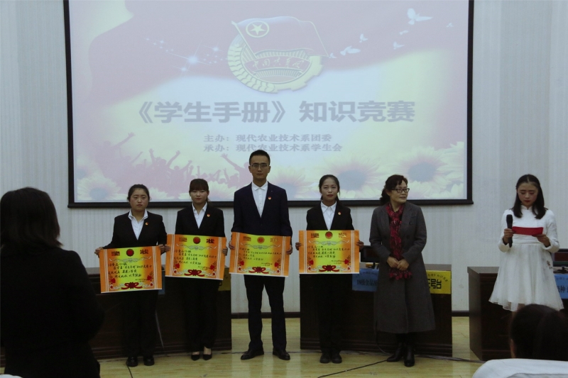 為切實(shí)貫徹學(xué)院教書(shū)育人、管理育人、服務(wù)育人的理念,營(yíng)造良好的校園文化氛圍,增強(qiáng)學(xué)生的自我教育、自我管理、自我服務(wù)、自我監(jiān)督的意識(shí)。1018日,現(xiàn)代農(nóng)業(yè)技術(shù)系在正德廳舉辦了首屆學(xué)生手冊(cè)知識(shí)競(jìng)賽。本次活動(dòng)由系團(tuán)委舉辦,系學(xué)生會(huì)承辦,2018級(jí)各班選派3名隊(duì)員參加。系黨總支晏素珍、全體班主任觀看比賽。