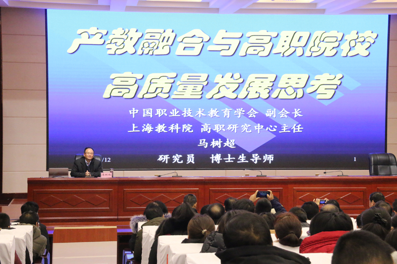 2018年12月11日,學(xué)院邀請到全國著名職業(yè)教育專家,上海教科院高職研究中心主任,博士生導(dǎo)師、馬樹超研究員來我院指導(dǎo)辦學(xué)工作,并作了“綠洲講壇”《產(chǎn)教融合與高職院校高質(zhì)量發(fā)展》主旨報告。
