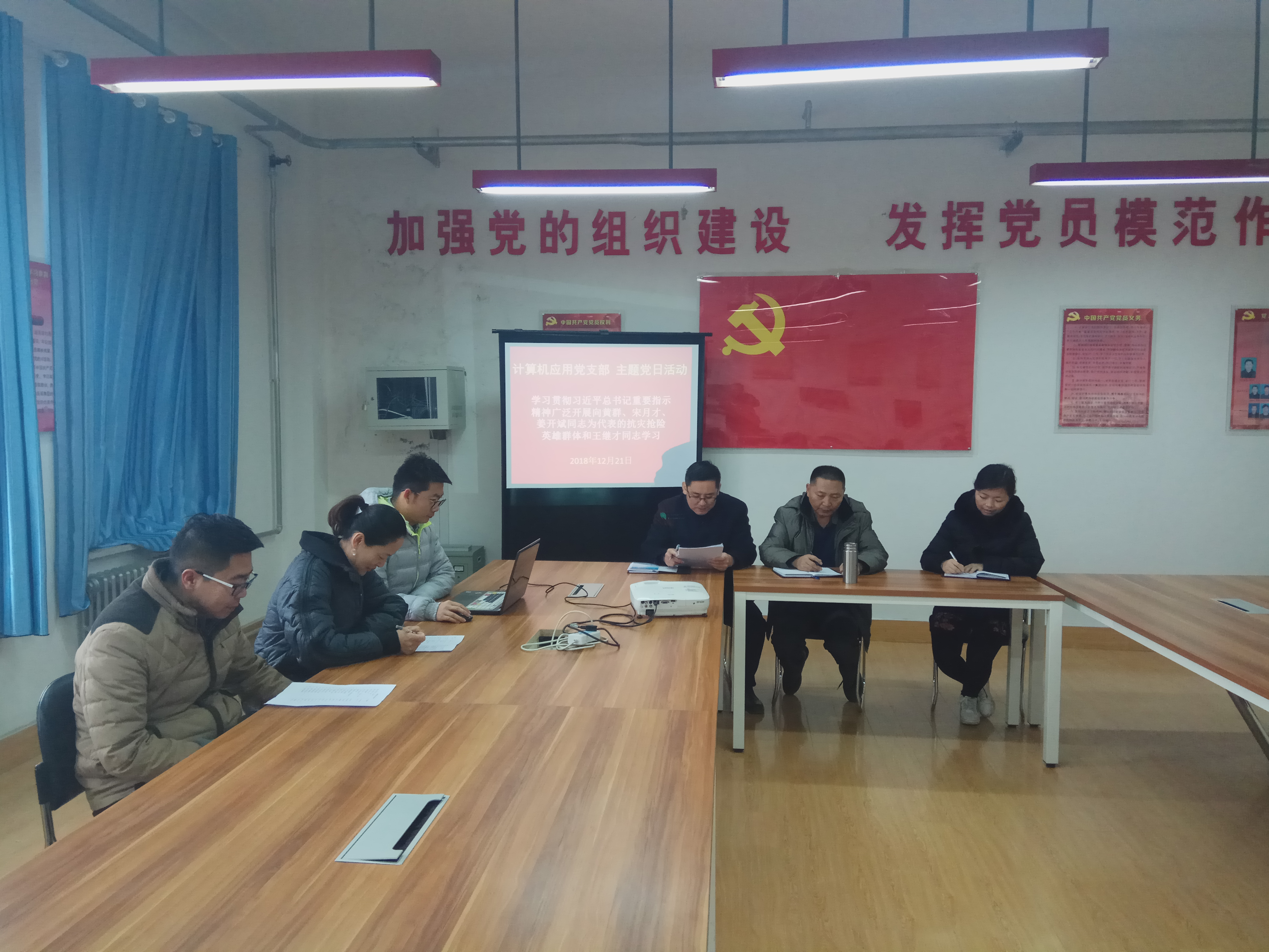 2018年12月21日,電子及網(wǎng)絡(luò)黨支部組織開展“不忘初心、牢記使命——學(xué)習(xí)全國、全省優(yōu)秀共產(chǎn)黨員先進(jìn)事跡”主題黨日活動,電子及網(wǎng)絡(luò)黨支部全體黨員參加學(xué)習(xí)。