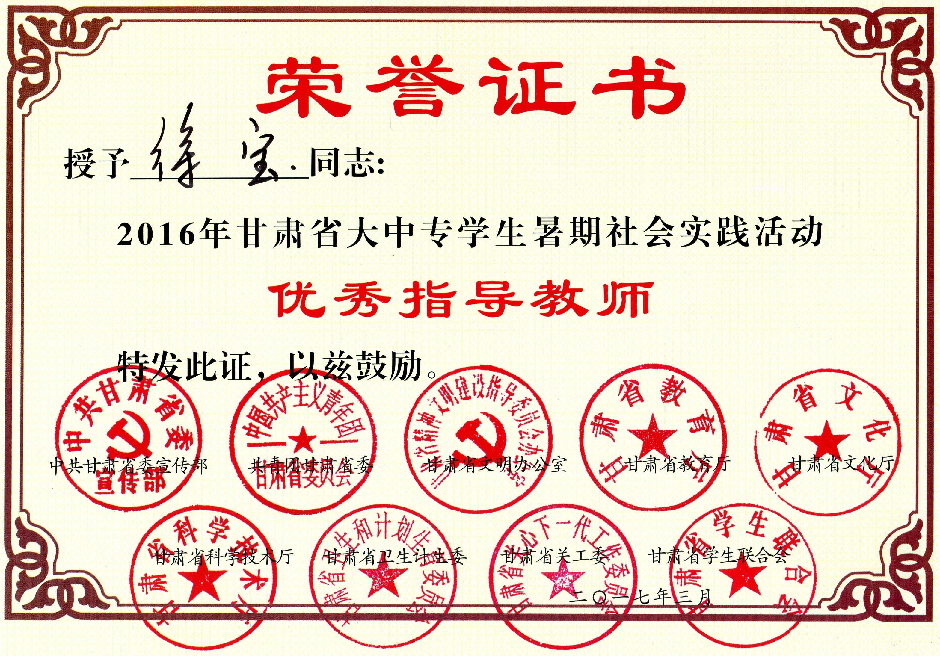 甘肅省大中專(zhuān)學(xué)生暑期社會(huì)實(shí)踐活動(dòng)優(yōu)秀指導(dǎo)教師