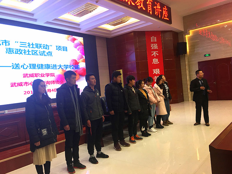 12月4日晚上,學(xué)生工作處聯(lián)合武威市“三社聯(lián)動(dòng)”惠政社區(qū)試點(diǎn)項(xiàng)目在學(xué)院菁英廳舉辦了心理健康專題講座暨心理信息員培訓(xùn)。此次講座邀請(qǐng)武威市心理咨詢師協(xié)會(huì)會(huì)長何飛老師主講,學(xué)院各系輔導(dǎo)員、2017級(jí)、2018級(jí)班級(jí)心理信息員、心翼心理社團(tuán)會(huì)員等220多人聆聽了講座。學(xué)生工作處處長王守云主持活動(dòng)。
