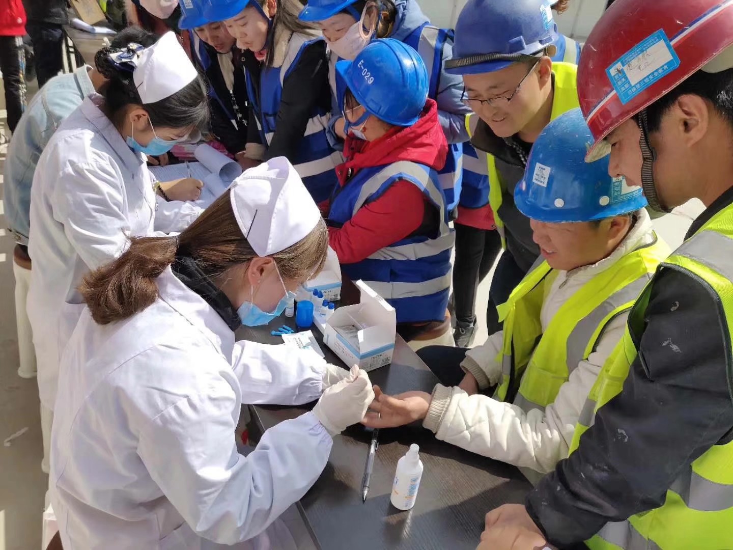 ? ? 到達(dá)活動現(xiàn)場后,疾控中心工作人員和志愿者們在聶老師和楊杰的安排下,按照預(yù)定方案迅速進(jìn)入到工作狀態(tài) ,為工作在那里的300多名農(nóng)民工人測量血壓、檢查視力、檢測丙肝和艾滋病病毒;宣傳健康知識并贈送春季常見傳染疾病及艾滋病病毒預(yù)防宣傳手冊;活動結(jié)束時,還為中建四局的農(nóng)民工人發(fā)放了活動紀(jì)念品。
