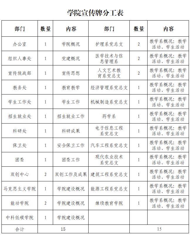 見(jiàn)“學(xué)院宣傳牌分工表”。數(shù)量不夠或者表中未涉及到的部門、單位,如果需要可另行向宣傳統(tǒng)戰(zhàn)部提出申請(qǐng)。