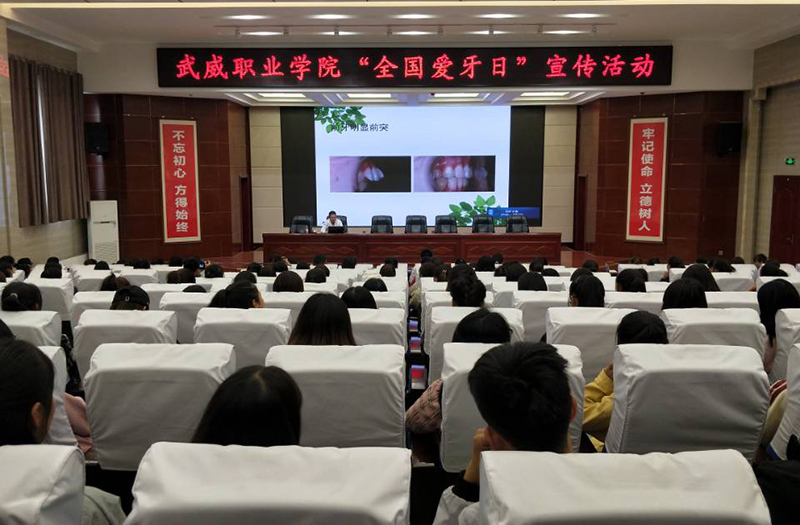 學院婦聯(lián)邀請武威腫瘤醫(yī)院口腔科主任韓冬做題為《青年口腔保健知識》的講座。韓冬結(jié)合多年口腔疾病診療經(jīng)驗,從青年口腔衛(wèi)生、口腔疾病預防及口腔正畸處理等方面入手,做了精彩講解,借助牙齒道具展示了正確的刷牙方法,并對同學們的各類口腔問題作了解答。講座結(jié)束后,武威腫瘤醫(yī)院和愛牙協(xié)會在大學生活動中心前廣場為同學們開展義診活動,發(fā)放口腔健康宣傳資料600余份。