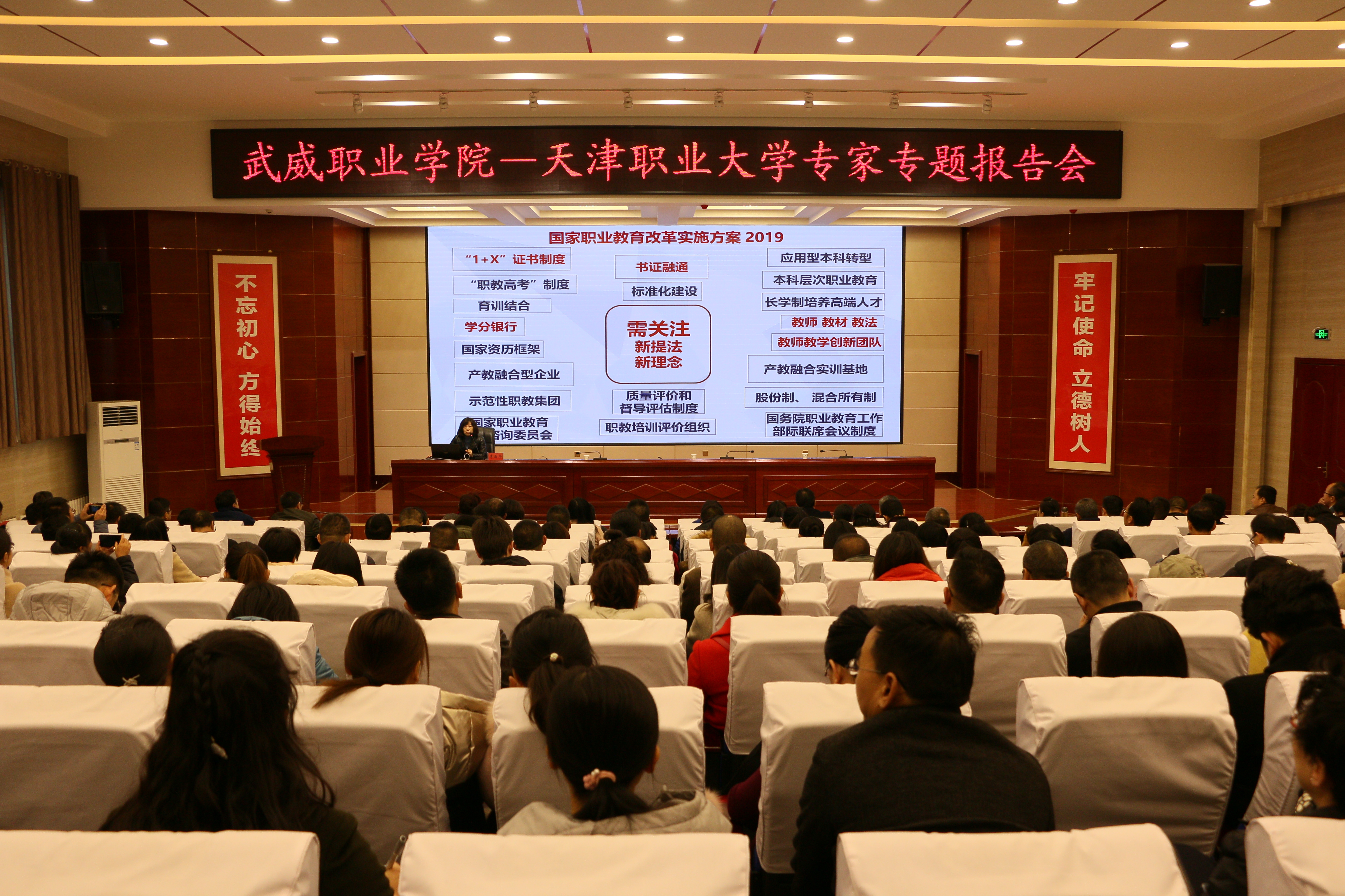 11月20日,武威職業(yè)學(xué)院“綠洲講壇”第27期在學(xué)院菁英廳舉行,本期活動邀請到天津職業(yè)大學(xué)汽車學(xué)院院長李晶華作主題為“《國家職業(yè)教育改革實(shí)施方案》解讀”的報(bào)告。學(xué)院領(lǐng)導(dǎo)班子、中層干部、教師代表220余人參加了報(bào)告會。本期講壇由學(xué)院黨委書記、院長趙明主持。