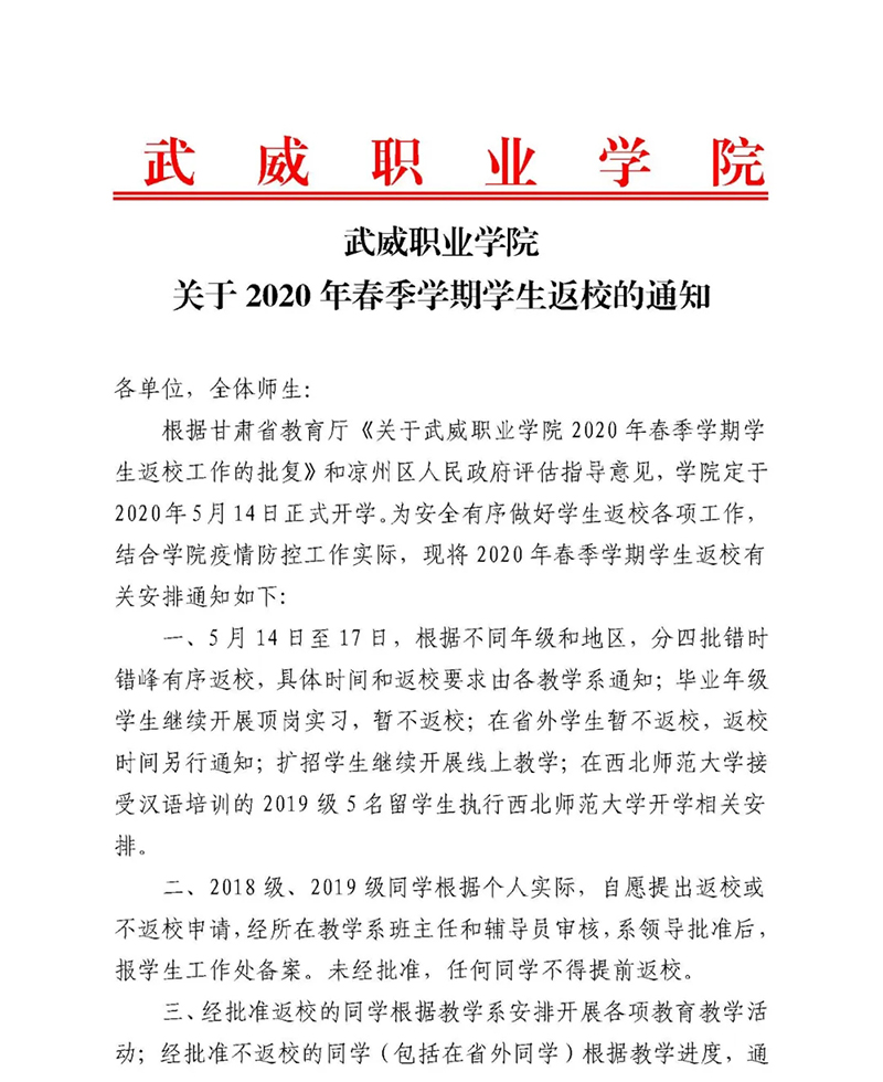 武威職業(yè)學院關(guān)于2020年春季學期學生返校的通知