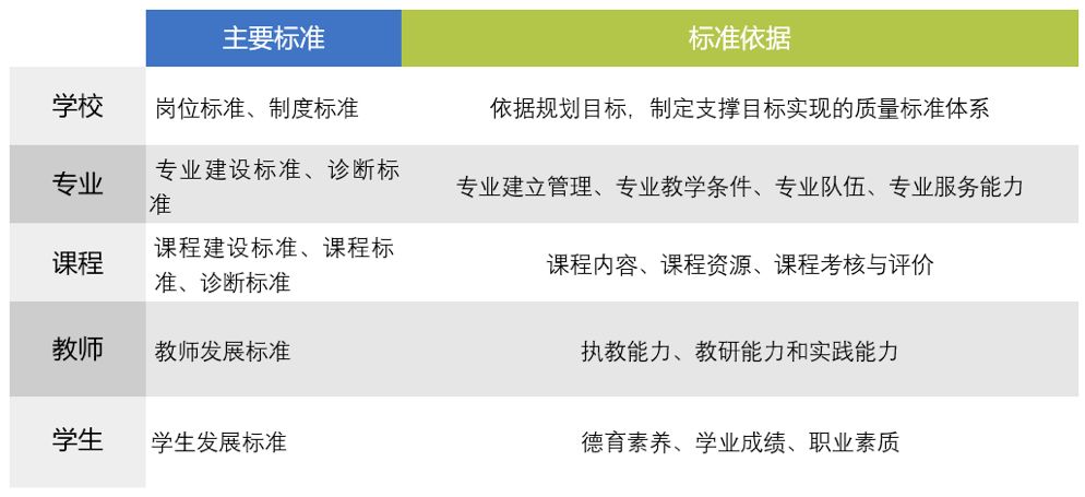 標(biāo)準(zhǔn)制定要體現(xiàn)多元質(zhì)量觀,采用剛性與柔性相結(jié)合的辦法,解決特色發(fā)展與創(chuàng)新發(fā)展的問題,堅(jiān)持“目標(biāo)導(dǎo)向與問題導(dǎo)向”的統(tǒng)一。從實(shí)際出發(fā),查找問題、研究問題、解決問題,重點(diǎn)解決學(xué)校內(nèi)部治理中存在的“透明管理”等突出問題;從專業(yè)建立管理、專業(yè)教學(xué)條件、專業(yè)隊(duì)伍、專業(yè)服務(wù)能力等維度制定專業(yè)建設(shè)標(biāo)準(zhǔn)和診斷標(biāo)準(zhǔn);從課程內(nèi)容、課程資源、課程考核與評(píng)價(jià)等維度制定課程建設(shè)標(biāo)準(zhǔn)、課程標(biāo)準(zhǔn)和課程診斷標(biāo)準(zhǔn);教師發(fā)展標(biāo)準(zhǔn)要以提升教師的執(zhí)教能力、教研能力和實(shí)踐能力為要素;學(xué)生發(fā)展標(biāo)準(zhǔn)要重點(diǎn)考慮學(xué)生的德育素養(yǎng)、學(xué)業(yè)成績(jī)、職業(yè)素質(zhì)。通過標(biāo)準(zhǔn)體系的打造,形成學(xué)校內(nèi)部質(zhì)量保證體系的標(biāo)準(zhǔn)鏈。