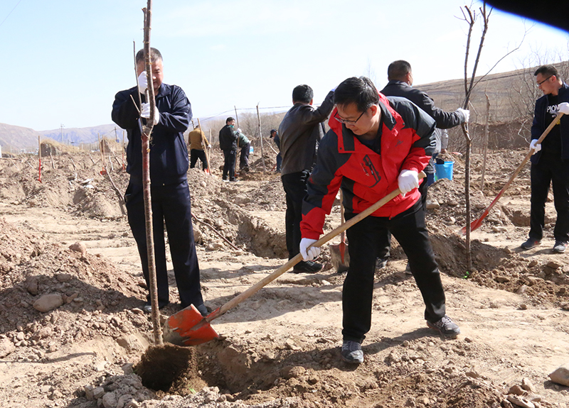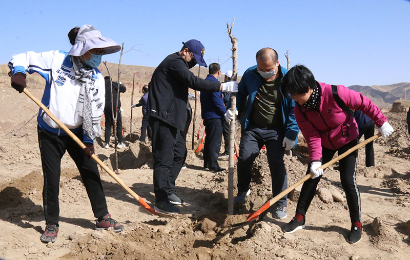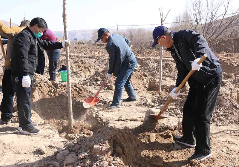 春風吹拂處,新綠綻枝頭。為深入學習貫徹習近平總書記視察甘肅的重要講話和批示精神,認真踐行綠水青山就是金山銀山的發(fā)展理念,實施綠色發(fā)展戰(zhàn)略,進一步加強祁連山生態(tài)環(huán)境保護與治理,幫助幫扶鎮(zhèn)打贏脫貧攻堅戰(zhàn),實施鄉(xiāng)村振興戰(zhàn)略,4月9日,學院領導班子成員、幫扶干部、駐村干部及部分教職工70多人深入結對幫扶鎮(zhèn)——黑松驛鎮(zhèn)開展義務植樹活動,建設“生態(tài)示范林”。春光沐浴的祁連山腳下黑松驛鎮(zhèn),春意盎然,生機勃勃,正是植樹好時節(jié)。廣大教職工一下車就拿起鐵鍬到植樹現(xiàn)場,與黑松驛鎮(zhèn)政府部分干部一起投入植樹活動,按照“橫看直線側一線、三埋兩踩一提苗”的技術要求,三人一組,分工協(xié)作,有序配合,揮鍬培土、扶苖踩土、圍堰澆水,現(xiàn)場一派熱火朝天的勞動景象。當天植樹育林約20余畝,一棵棵新栽的樹苗整齊排列,迎風挺立。通過義務植樹,廣大教職工用實際行動傳播著生態(tài)文明、綠色發(fā)展理念,切實幫助幫扶鎮(zhèn)綠起來,美起來,富起來。