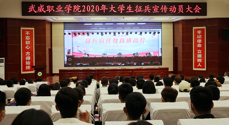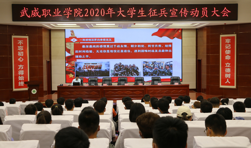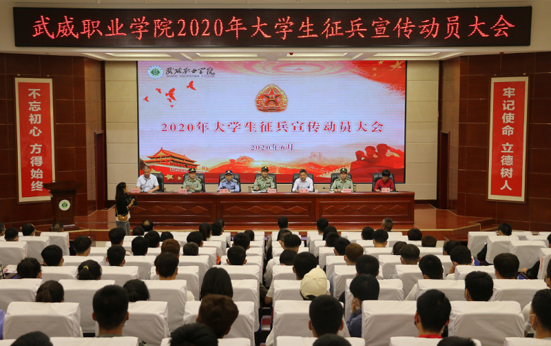 6月10日上午,學院2020年大學生征兵宣傳動員大會在菁英廳舉行。武威軍分區(qū)司令員張國輝、武威軍分區(qū)動員處處長劉忠、涼州區(qū)人武部部長闞延貴、涼州區(qū)人武部政委丁俊強,學院黨委書記、院長趙明,副院長何毅出席會議。各院系負責人、輔導員和學生代表共200人參加了會議。會議由副院長王守云主持。