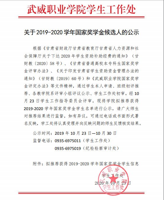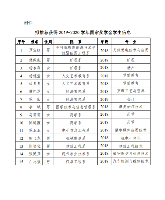 關于2019-2020學年國家獎學金候選人的公示
