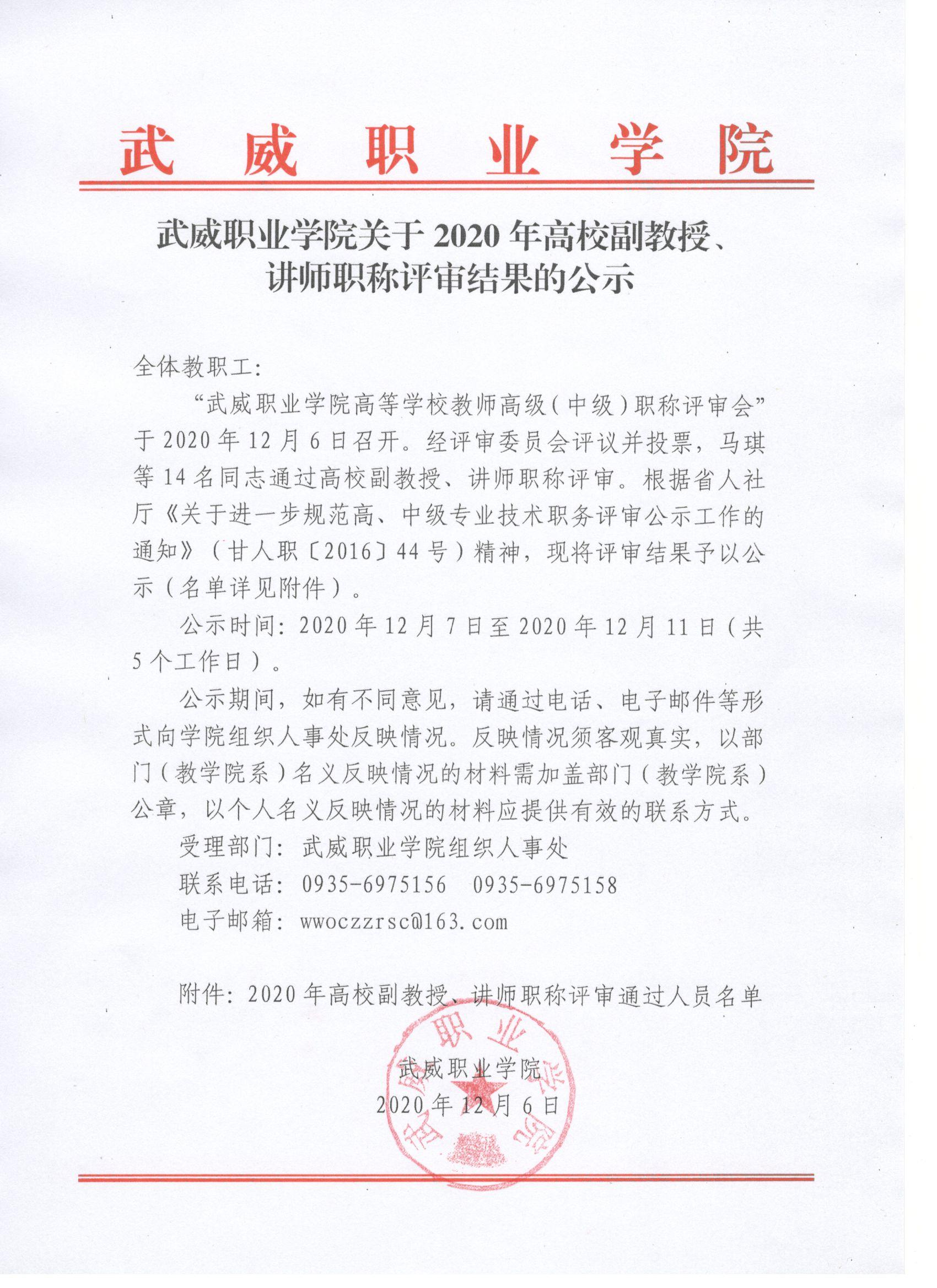 武威職業(yè)學(xué)院關(guān)于2020年高校副教授、講師職稱評(píng)審結(jié)果的公示