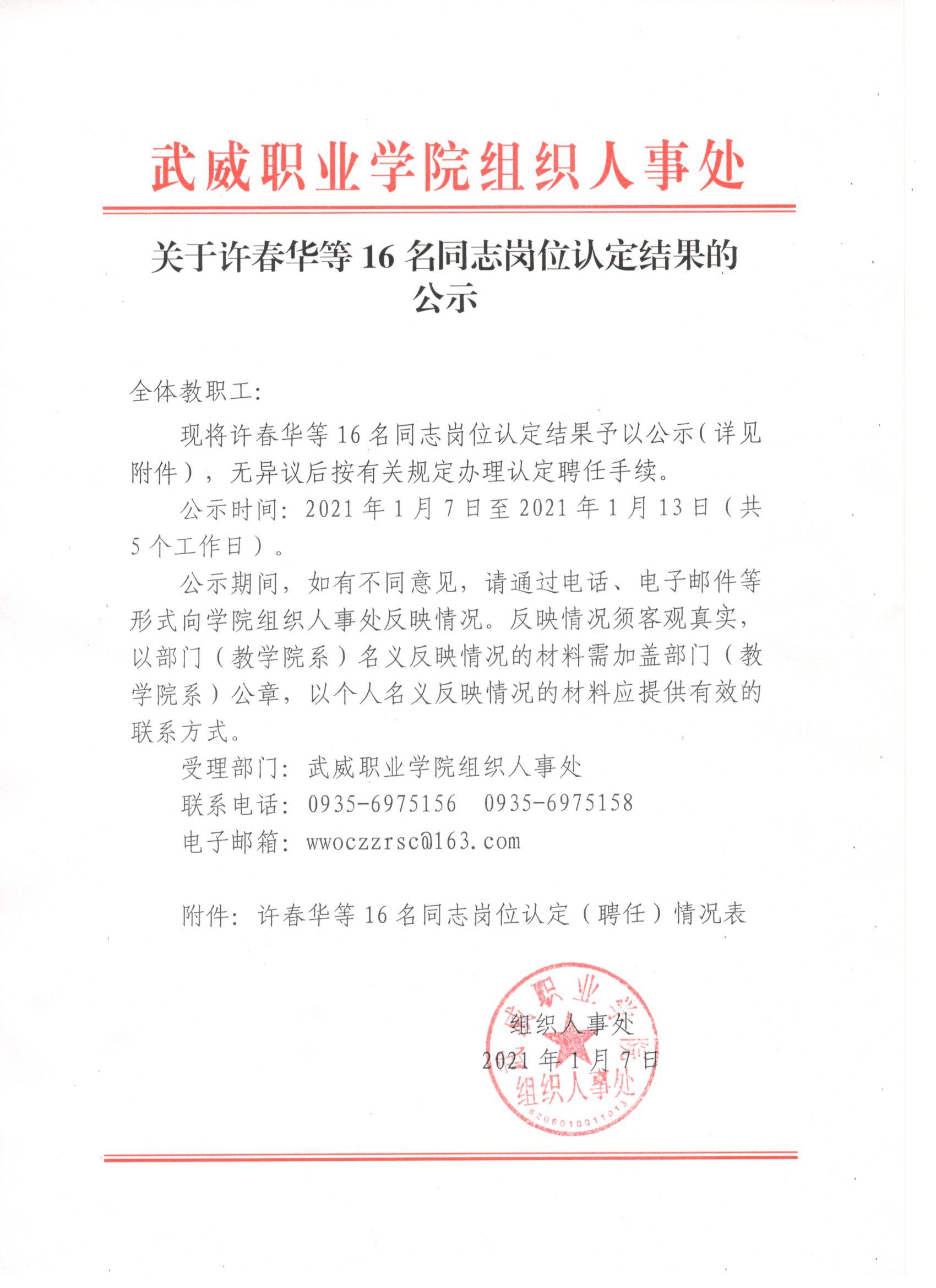關(guān)于許春華等16名同志崗位認定結(jié)果的公示