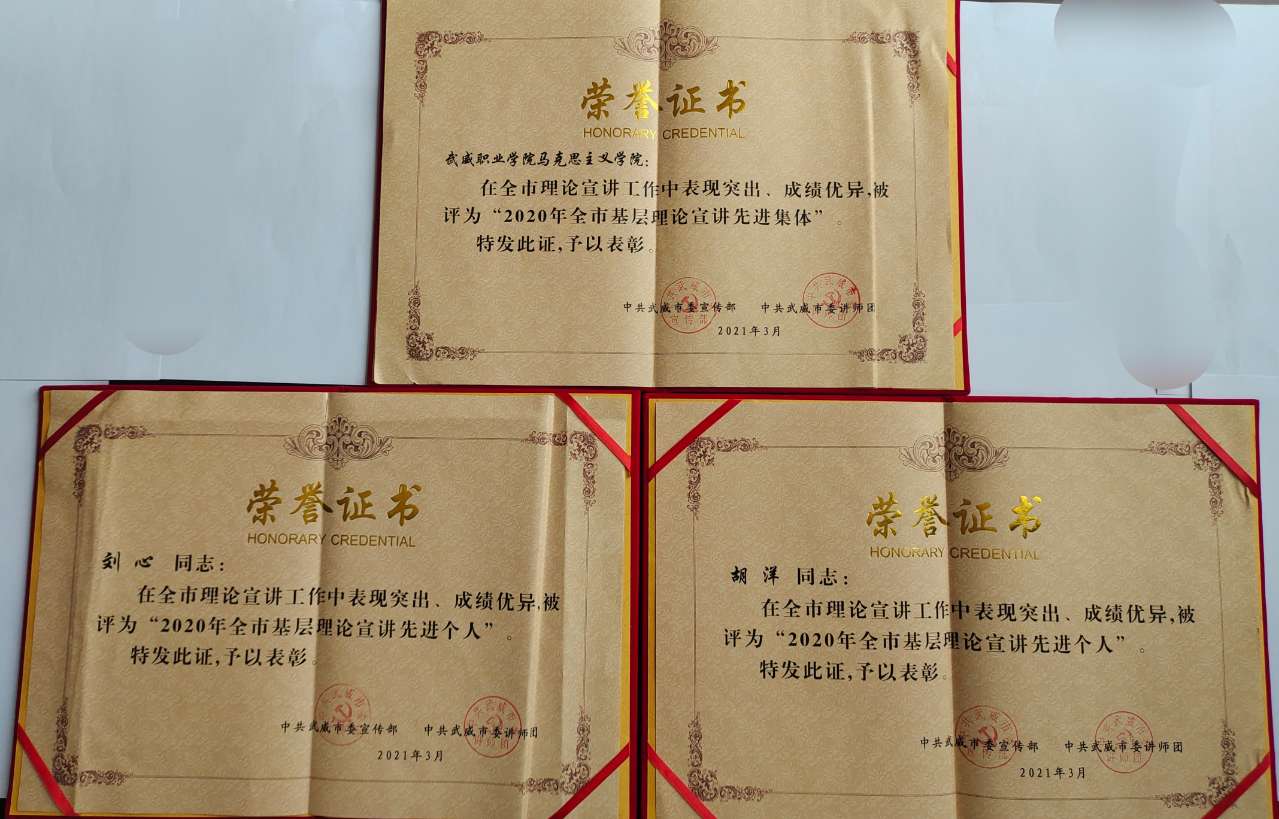 3月25日下午,武威市委宣傳部組織召開了“黨史教育專題宣講動(dòng)員會(huì)暨2020年宣講工作先進(jìn)集體和個(gè)人表彰會(huì)”。武威職業(yè)學(xué)院馬克思主義學(xué)院被授予“2020年全市基層理論宣講先進(jìn)集體”榮譽(yù)稱號(hào),同時(shí)馬克思主義學(xué)院教師、翟存祥名師工作室成員劉心、胡洋被授予“2020年全市基層理論宣講先進(jìn)個(gè)人”榮譽(yù)稱號(hào)。