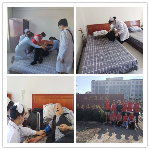 武威市涼州區(qū)雙城鎮(zhèn)敬老院目前共居住有102位老人,均為孤寡老人和五保戶,其中還有一部分殘疾老人。在敬老院里,志愿者們首先與院內(nèi)的八位照護(hù)員進(jìn)行了交流,向他們學(xué)習(xí)了如何照護(hù)老人。隨后,在院長的引領(lǐng)下,指導(dǎo)老師與志愿者們探望了部分老人,并了解了老人們目前的生活和身體狀況。在老人的居室內(nèi),指導(dǎo)老師與身患?xì)埣驳睦先擞H切交談并為他們進(jìn)行了心理疏導(dǎo);志愿者們?yōu)槔先藗儨y量血壓、整理衣物、收拾屋子;在照護(hù)員的協(xié)助下,兩位志愿者為不能下床的老人進(jìn)行了翻身、拍背等護(hù)理。老人們均表示活動很暖心,感謝志愿者們的愛心服務(wù)。