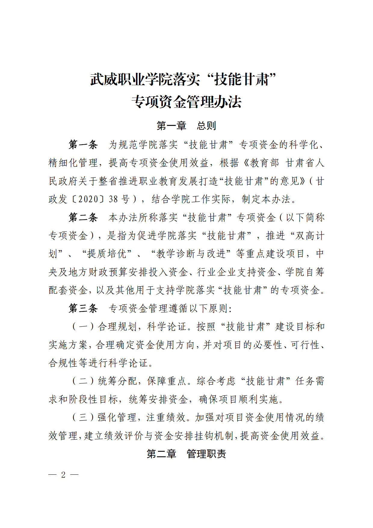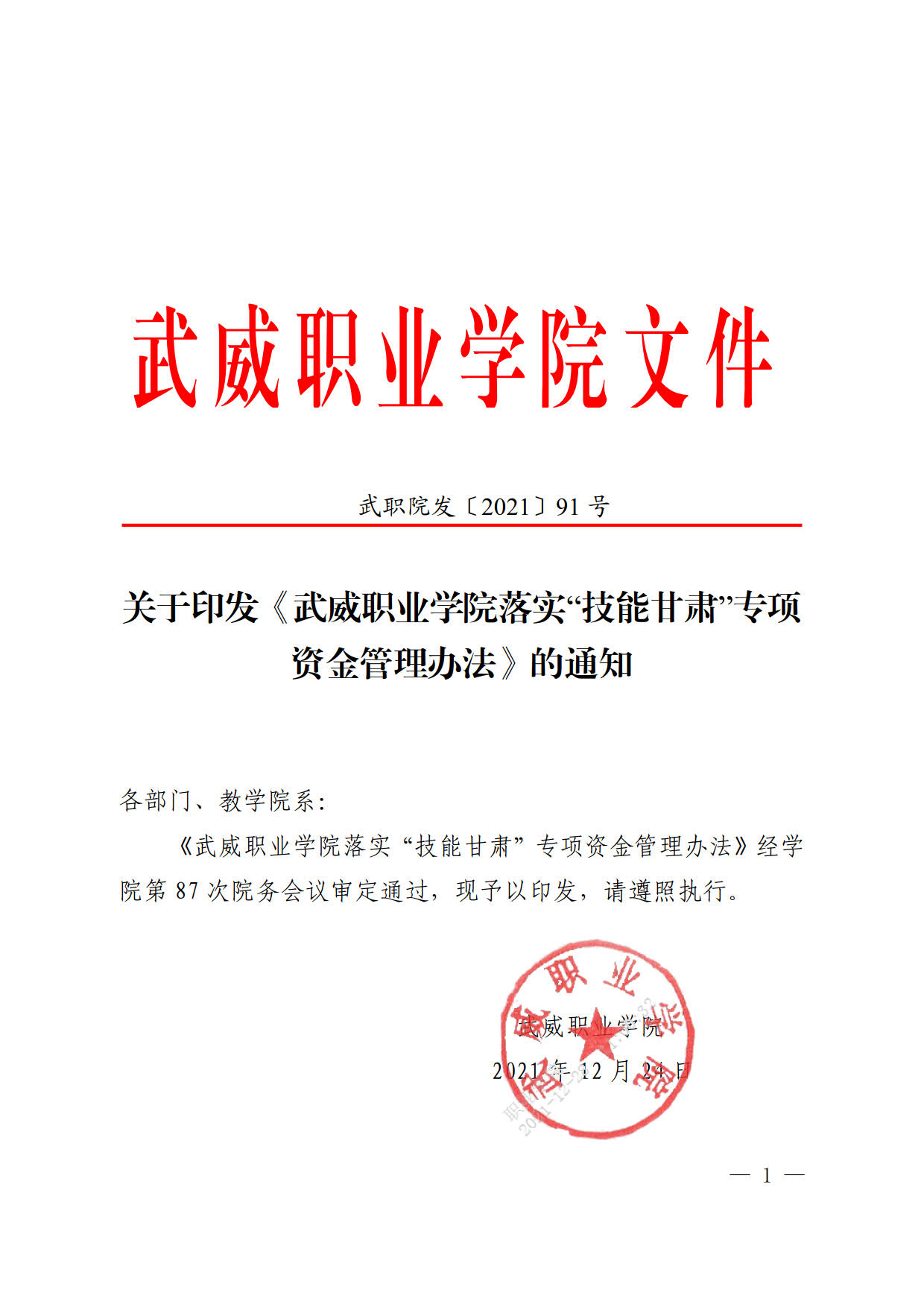 關于印發(fā)《武威職業(yè)學院落實“技能甘肅”專項資金管理辦法》的通知
