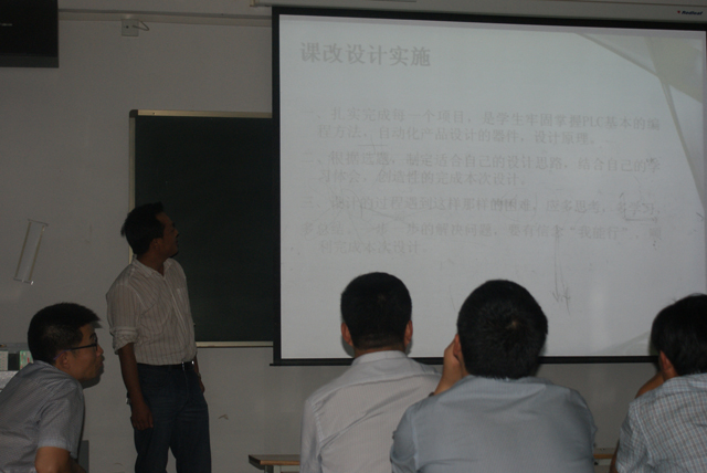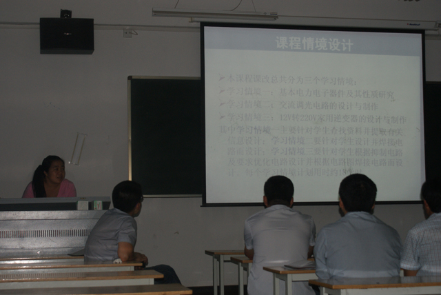首先,上學(xué)期五位老師對課改完成情況進行交流匯報。顏魯薪、何立國、張國祥、袁亞琳和張娟老師分別就上學(xué)期所帶課程《光伏材料制備與加工》、《光伏產(chǎn)品的生產(chǎn)與質(zhì)檢》、《電氣與PLC控制系統(tǒng)的運行與維護》、《風(fēng)能與利用技術(shù)》及《電力電子技術(shù)》等五門課程從課程規(guī)劃、課程實施、成果展示、教學(xué)評價四個方面進行了詳細(xì)的匯報。