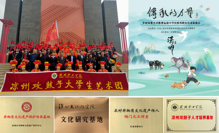 近年來,學(xué)校全力推進(jìn)“雙高計(jì)劃”項(xiàng)目建設(shè),組織成立了武威職業(yè)學(xué)院涼州攻鼓子大學(xué)生藝術(shù)團(tuán),聘請國家級非遺代表性傳承人楊門元親傳技藝,并開展了系列展演活動,著力打造特色校園文化品牌,助推文化繁榮、社會文明的新武威和華夏文明傳承創(chuàng)新區(qū)建設(shè),服務(wù)鄉(xiāng)村振興戰(zhàn)略。