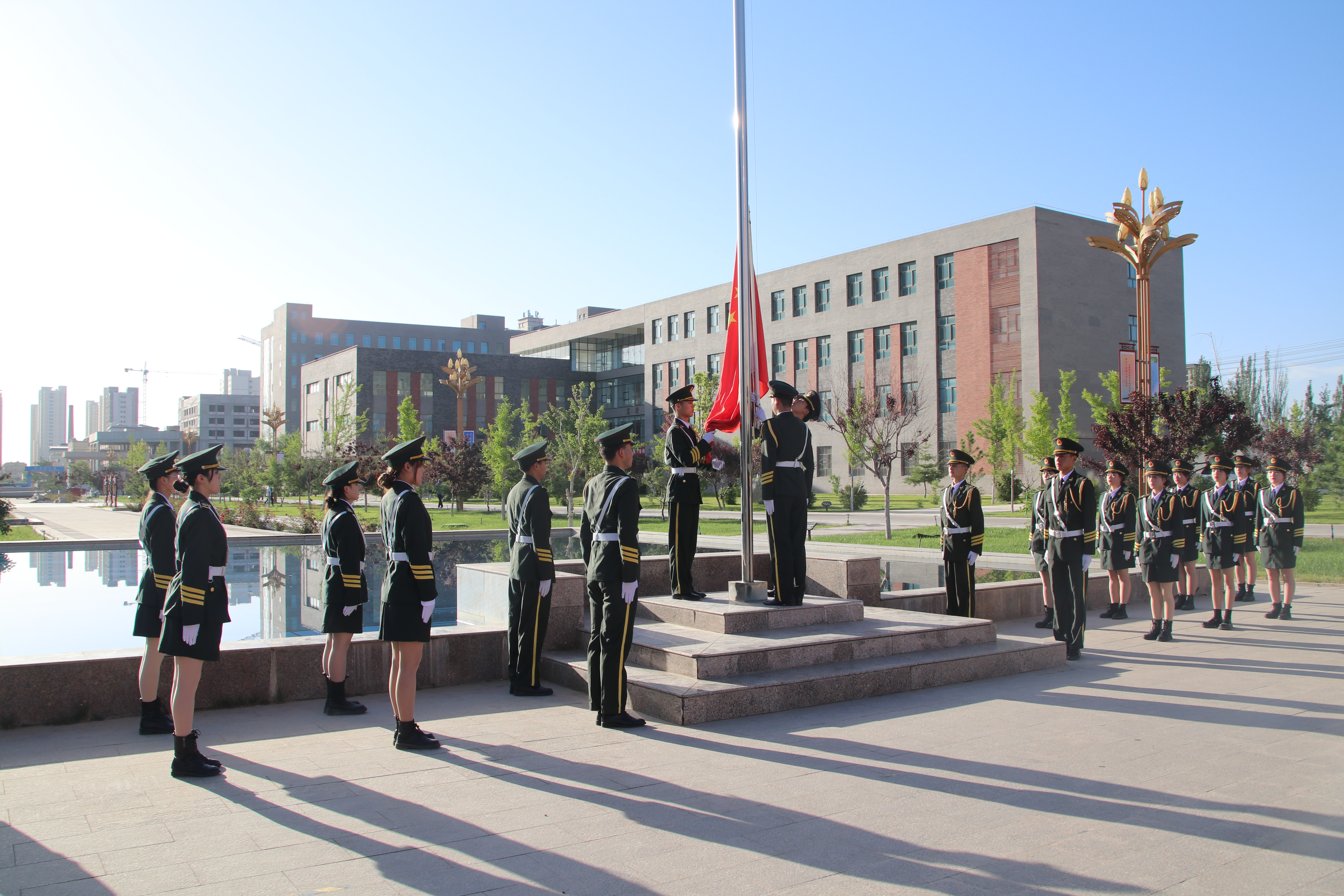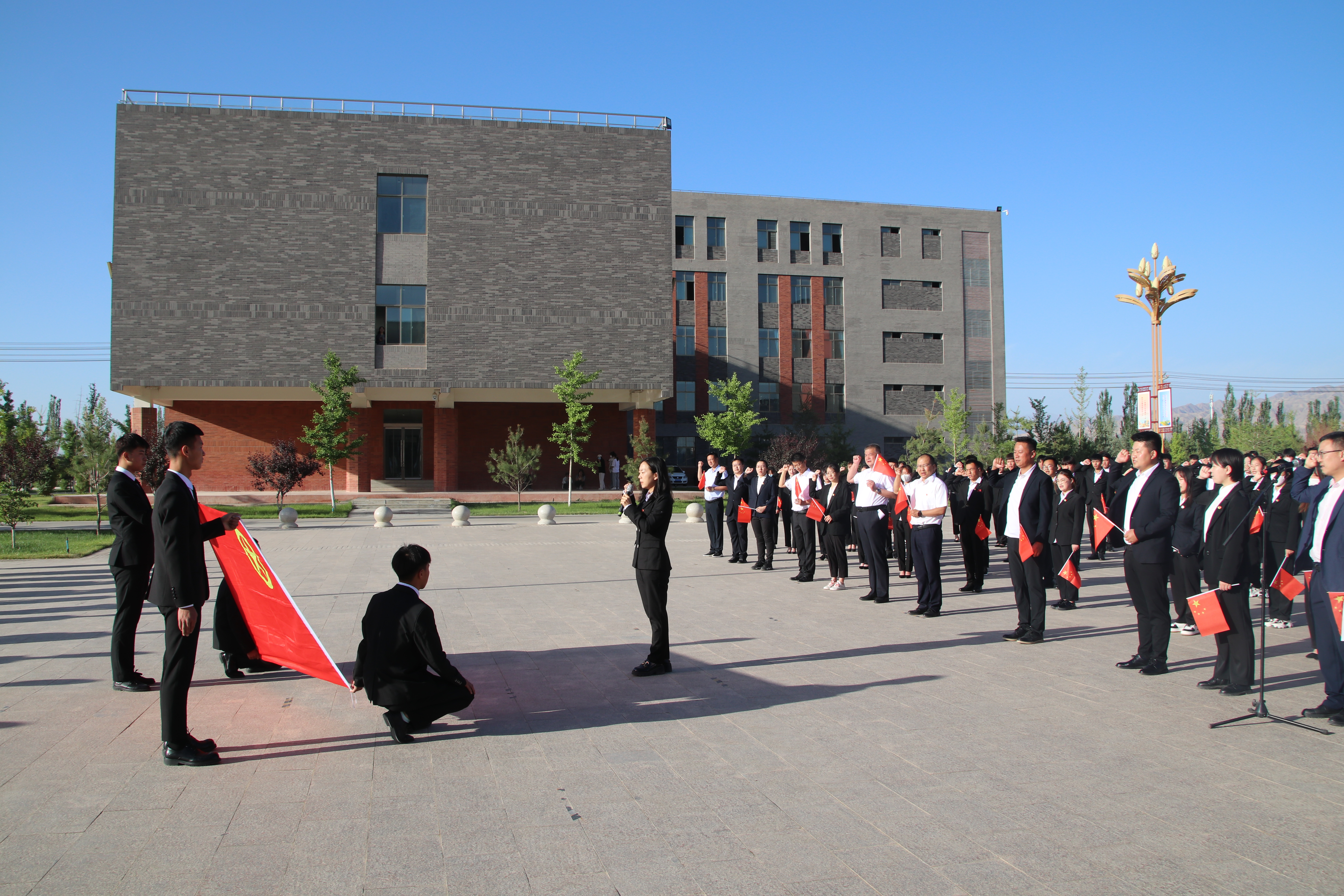 迎著朝陽,五星紅旗在國旗護(hù)衛(wèi)隊(duì)的護(hù)送下緩緩入場(chǎng),昂昂國歌奏響,國旗迎風(fēng)飄揚(yáng),全場(chǎng)師生齊唱國歌。學(xué)生代表在國旗下致獻(xiàn)詞,對(duì)黨許下青春的誓言,獻(xiàn)詞之后舉行了嚴(yán)肅莊重的重溫入團(tuán)誓詞儀式,增強(qiáng)了共青團(tuán)員的組織光榮感和歸屬感,激發(fā)了團(tuán)員青年的使命感和責(zé)任感。最后,全體團(tuán)員青年齊唱《共青團(tuán)團(tuán)歌》,用響亮的歌聲表達(dá)建團(tuán)百年再出發(fā)的祝福,現(xiàn)場(chǎng)愛國熱情持續(xù)高漲。