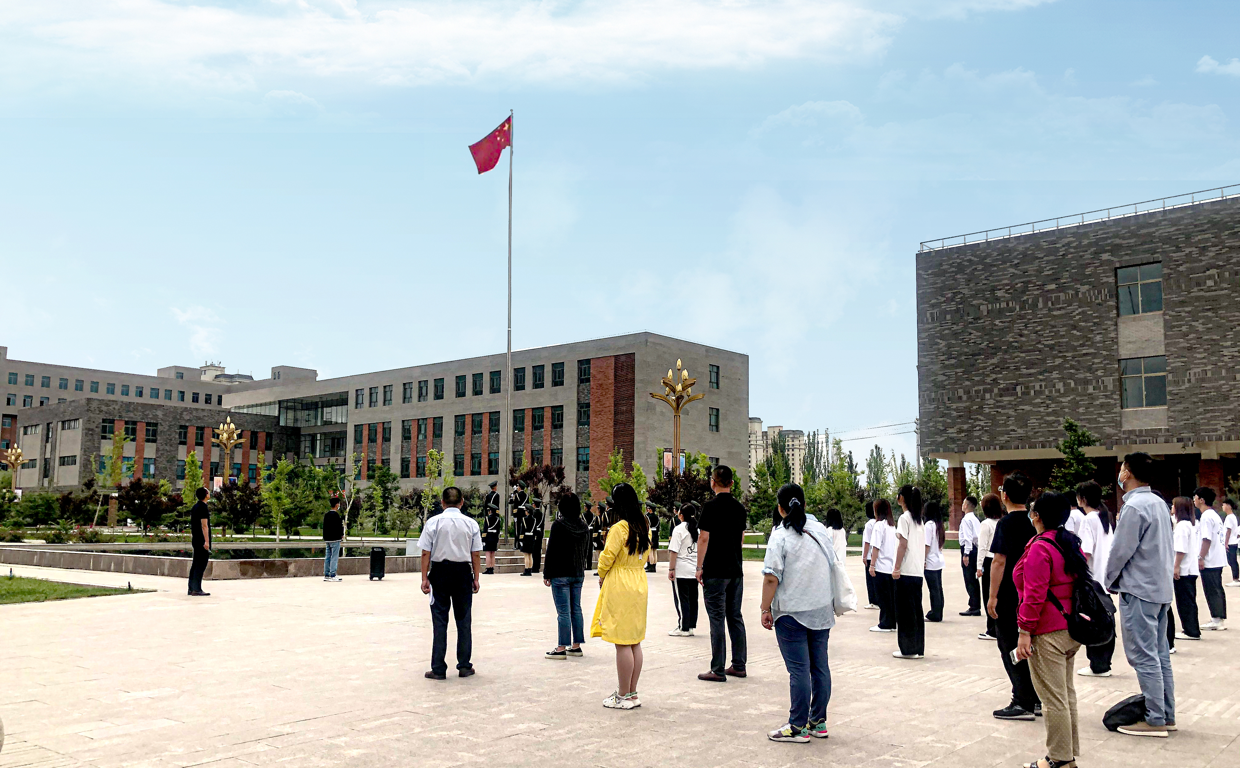 國旗護(hù)衛(wèi)隊(duì)旗手們踏著整齊堅(jiān)定的步伐,護(hù)送鮮艷的五星紅旗入場(chǎng),伴隨著雄壯的義勇軍進(jìn)行曲,鮮艷的五星紅旗冉冉升起。全體師生集體行注目禮,全場(chǎng)彌漫著一種莊嚴(yán)肅穆的氣息。