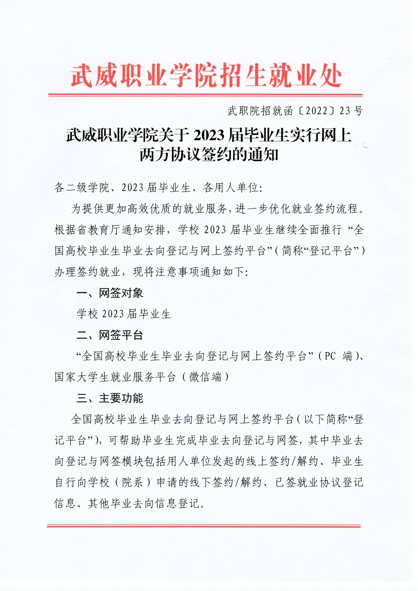 武威職業(yè)學(xué)院關(guān)于2023屆畢業(yè)生實行網(wǎng)上兩方協(xié)議簽約的通知