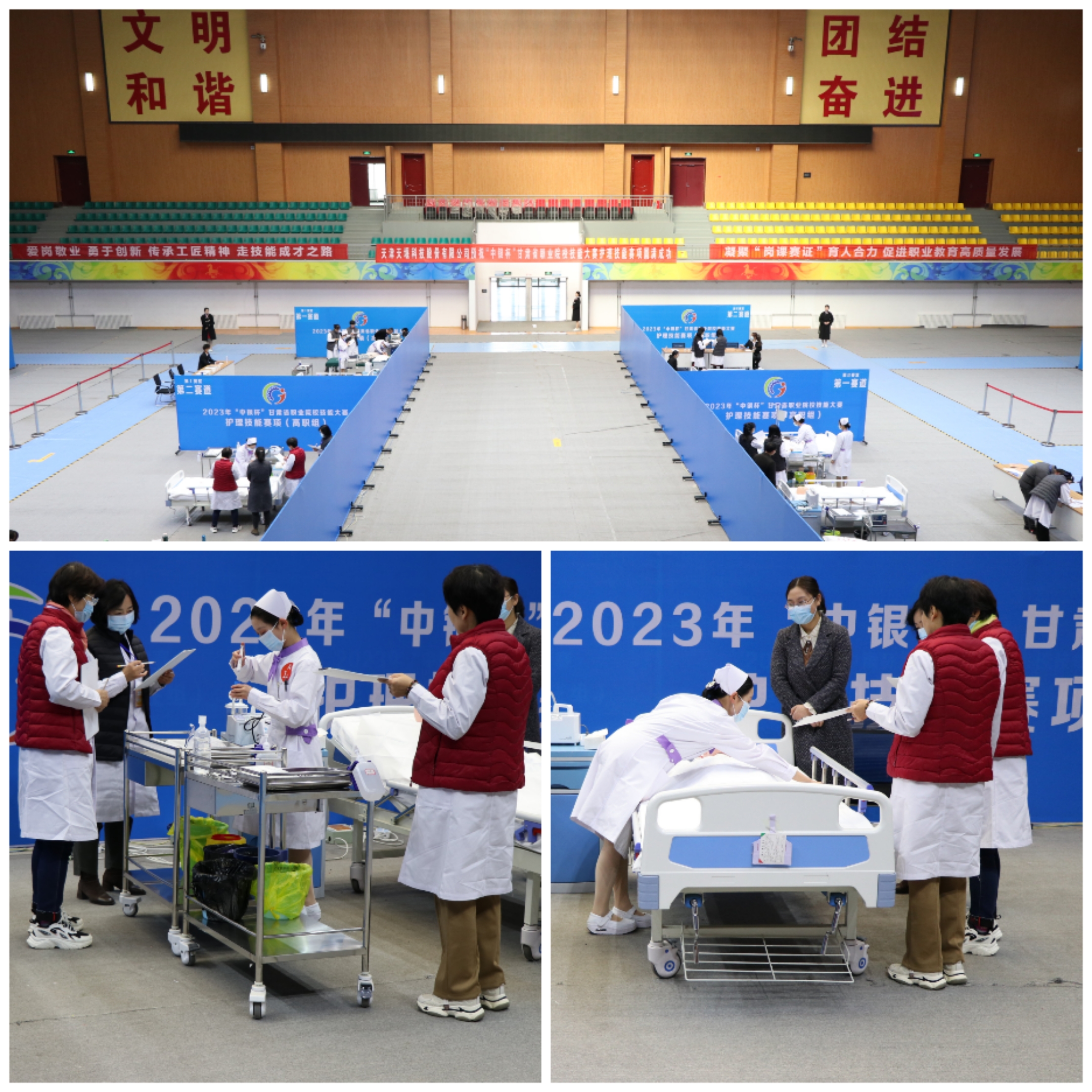 為全面貫徹落實省委辦公廳、省政府辦公廳《關(guān)于推動現(xiàn)代職業(yè)教育高質(zhì)量發(fā)展,加快“技能甘肅”建設(shè)的若干措施》,進一步推動打造“技能甘肅”工作,促進職業(yè)學(xué)校專業(yè)建設(shè)與教學(xué)改革,提高學(xué)生實踐動手能力和職業(yè)素養(yǎng),弘揚勞動光榮、技能寶貴、創(chuàng)造偉大的時代風(fēng)尚,引領(lǐng)職業(yè)學(xué)校適應(yīng)行業(yè)現(xiàn)狀及技術(shù)發(fā)展趨勢,檢驗教學(xué)成果,促進護理專業(yè)的教育教學(xué)改革。4月10日-4月12日,2023年“中銀杯”甘肅省職業(yè)院校技能大賽護理技能賽項在武威職業(yè)學(xué)院順利舉行。來自全省10所高職院校的25個團隊、50名學(xué)生和22名教師選手匯集武威職業(yè)學(xué)院賽場,共同譜寫護理人的工匠精神和大愛情懷。