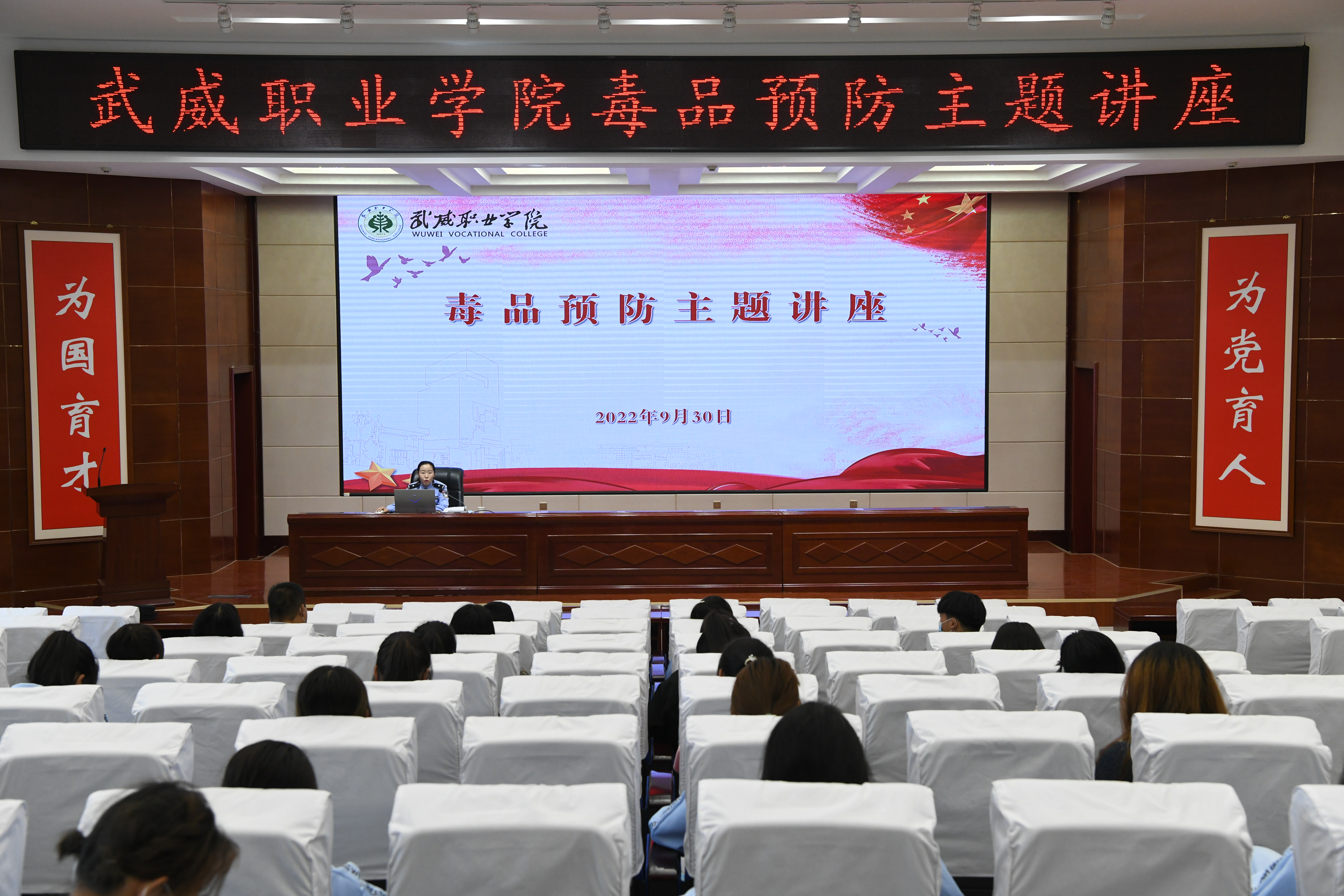 為進(jìn)一步加強(qiáng)學(xué)校毒品預(yù)防教育工作,不斷提高師生識(shí)毒、防毒、拒毒意識(shí),9月30日,學(xué)校安全保衛(wèi)處邀請(qǐng)武威市公安局涼州分局西關(guān)派出所民警王敏同志在學(xué)生發(fā)展中心菁英廳開展“健康人生 綠色無毒”預(yù)防毒品主題講座,各二級(jí)學(xué)院師生代表聆聽了講座,講座由安全保衛(wèi)處負(fù)責(zé)人李欣主持。