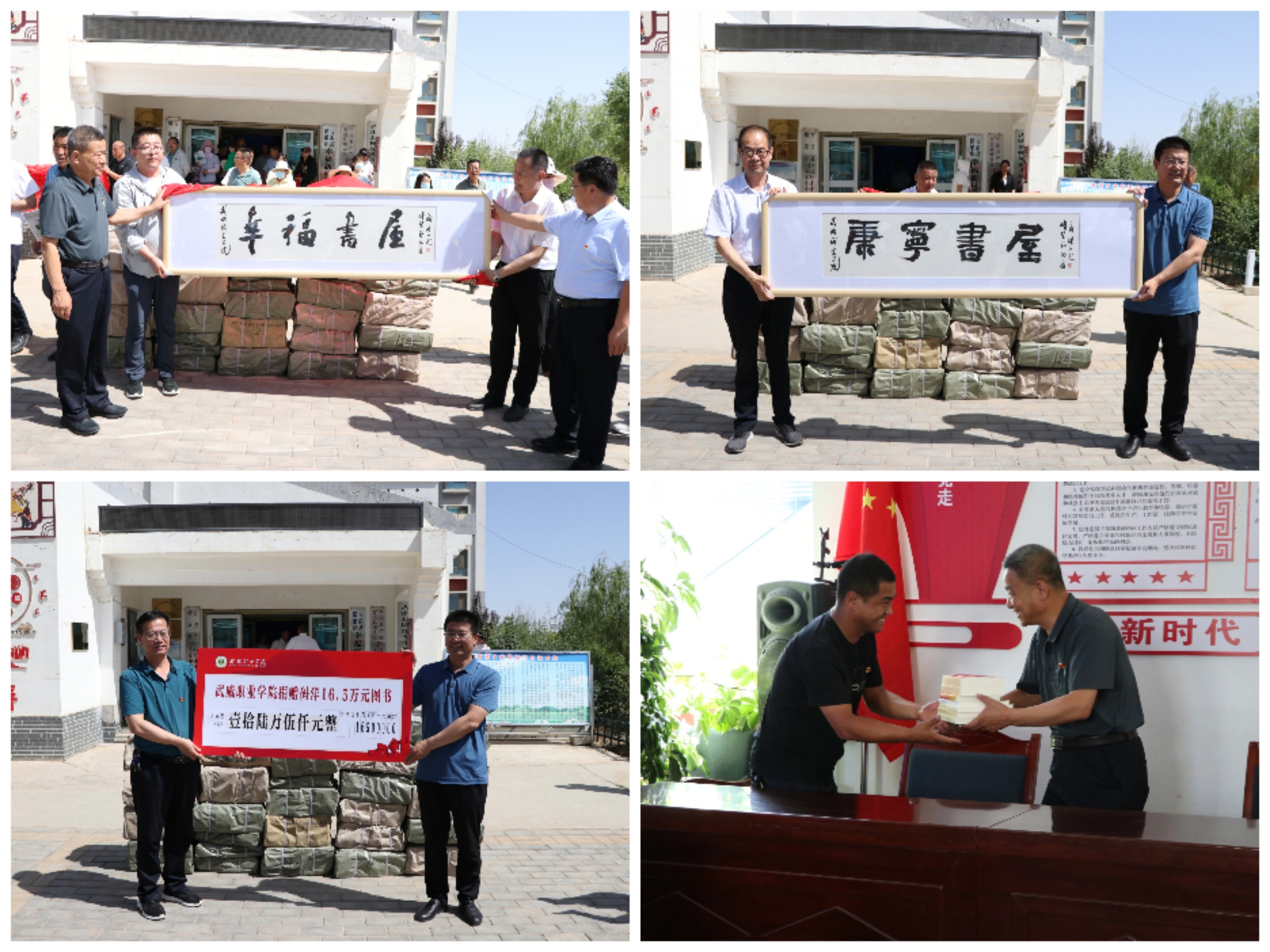 6月21日,學(xué)校文化振興簽約儀式暨農(nóng)家書(shū)屋揭牌捐書(shū)儀式在古浪縣橫梁鄉(xiāng)幸福新村隆重舉行,學(xué)校黨委書(shū)記、校長(zhǎng)趙明,黨委副書(shū)記翟存祥,黨委委員、副校長(zhǎng)張開(kāi)禮,橫梁鄉(xiāng)黨委書(shū)記何文國(guó),黨委副書(shū)記、鄉(xiāng)長(zhǎng)張熹中,村兩委成員、學(xué)校相關(guān)部門(mén)負(fù)責(zé)人和村民代表150多人參加活動(dòng)。