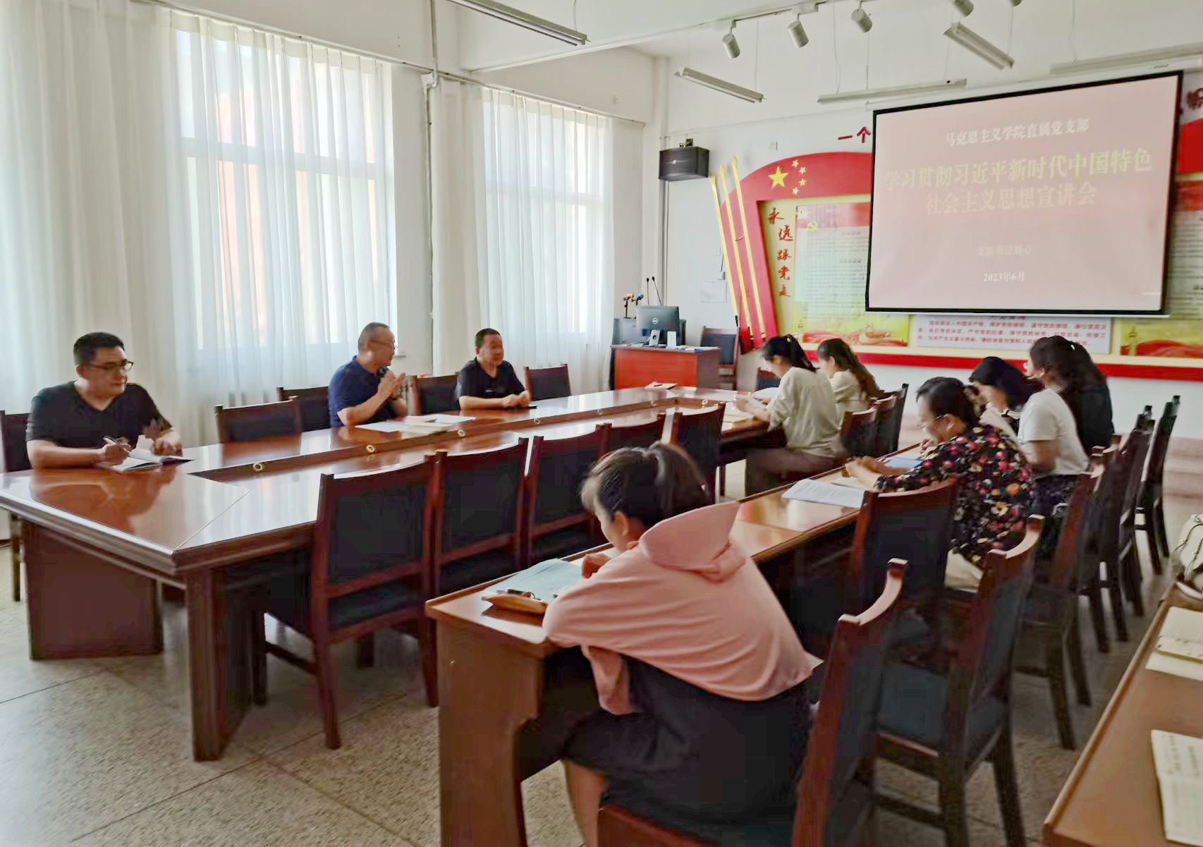 為推動學(xué)習(xí)貫徹習(xí)近平新時代中國特色社會主義思想主題教育走深走實,教育引導(dǎo)教師全面學(xué)習(xí)、深刻領(lǐng)會、準(zhǔn)確把握習(xí)近平新時代中國特色社會主義思想,按照學(xué)校宣講工作部署,6月29日,馬克思主義學(xué)院黨支部開展了學(xué)習(xí)貫徹習(xí)近平新時代中國特色社會主義思想主題教育專題宣講活動,黨支部書記劉心作宣講,支部全體黨員參加活動。