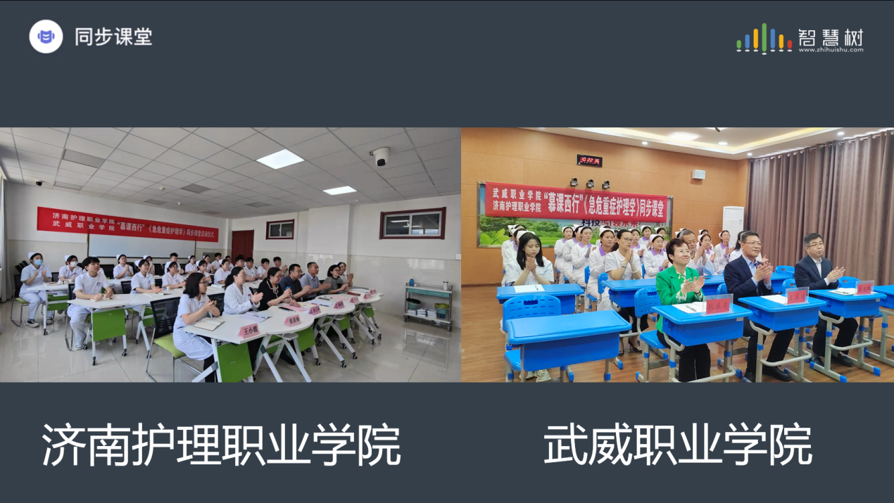 濟南護理職業(yè)學(xué)院黨委委員、副院長展永生在啟動儀式上致辭,介紹了濟南護理職業(yè)學(xué)院校史校情,提出兩所高校開展同步課堂的意義,兩校將以“慕課西行-同步課堂”為契機,探索教學(xué)新模式,加深優(yōu)質(zhì)資源共享、合作、交流。武威職業(yè)學(xué)院黨委委員、副校長王永緒在致辭中向兄弟院校介紹了我校的基本情況,并預(yù)祝本次活動圓滿成功,希望雙方學(xué)校能夠加深之間的合作與交流,攜手提升辦學(xué)質(zhì)量,推動高等教育的均衡發(fā)展,同時感謝智慧樹能夠提供這次機會使兩校相聚于云端,打破空間壁壘,跨越千里,進行了一次寶貴的信息化教學(xué)探索。