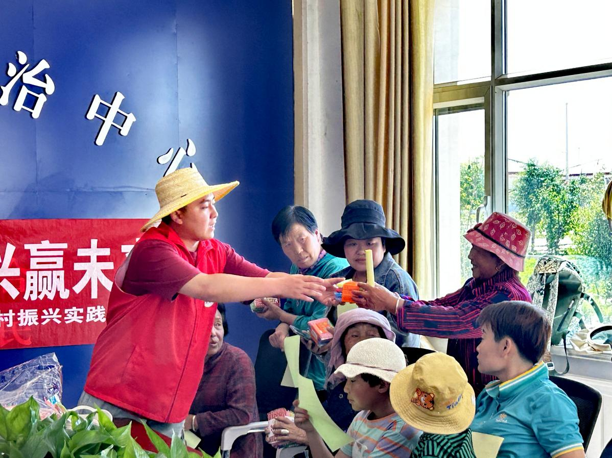 圖為實(shí)踐隊(duì)員為參與活動(dòng)的婦女發(fā)放推普彩頁(yè)和物品