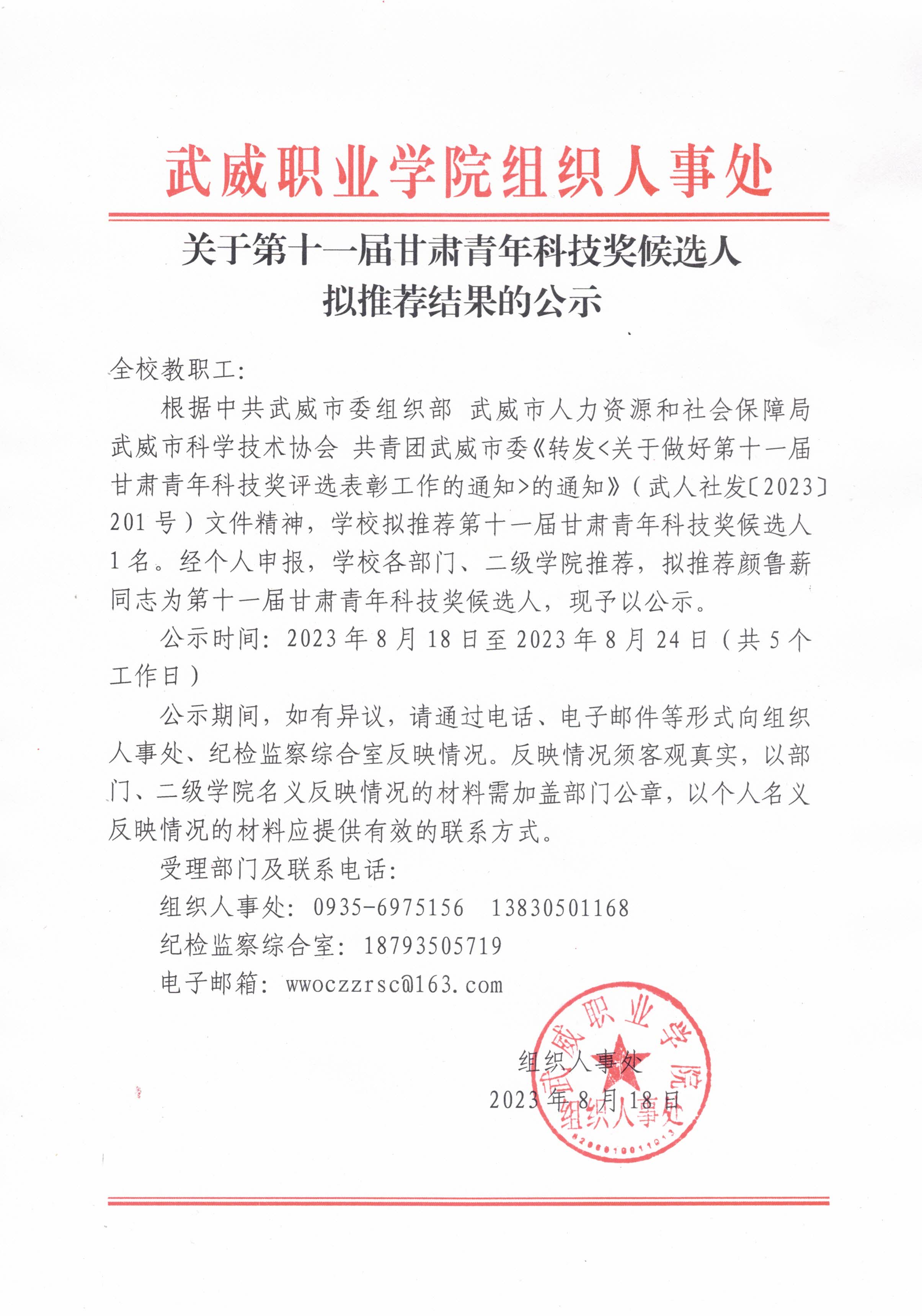 關(guān)于第十一屆甘肅青年科技獎候選人擬推薦結(jié)果的公示