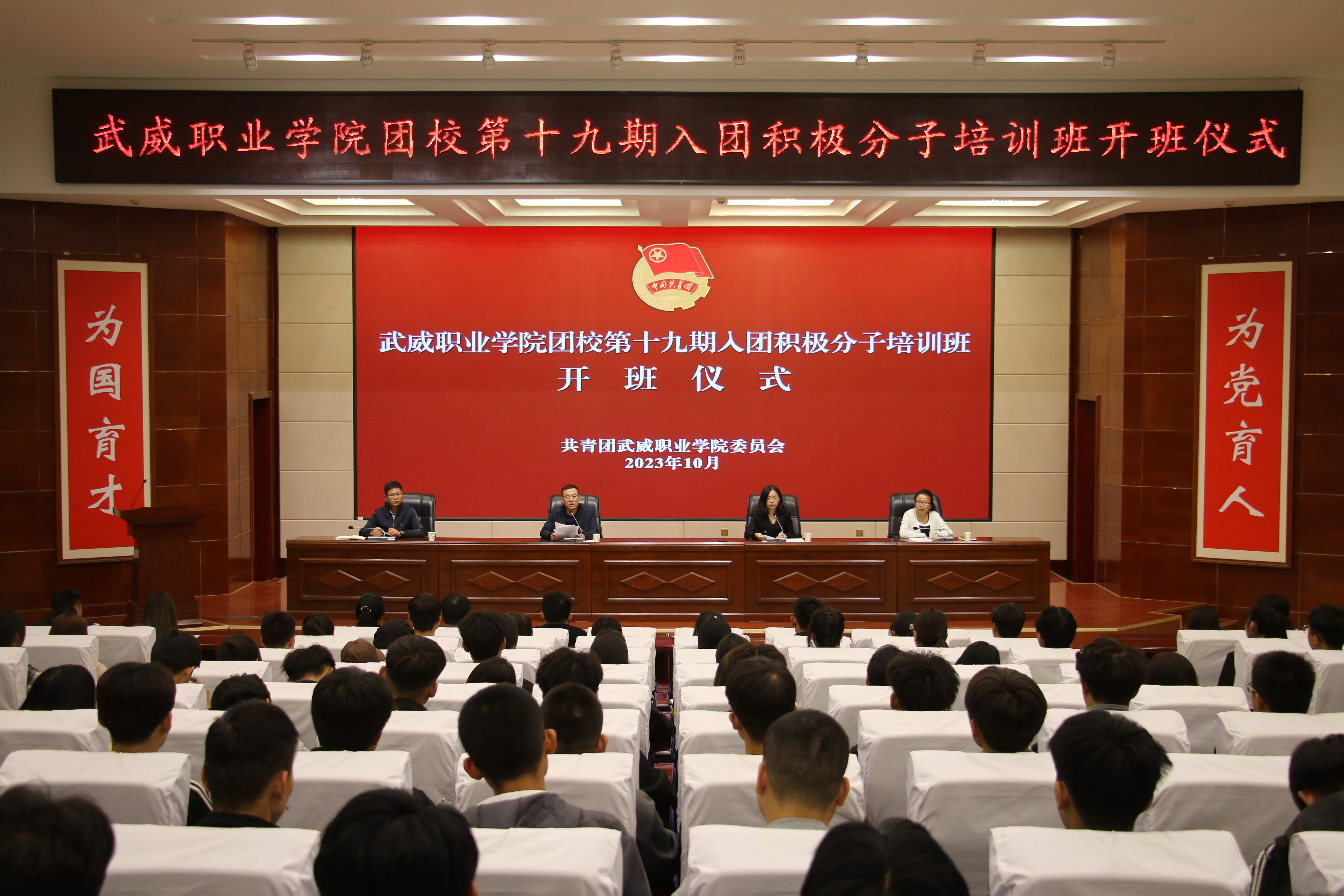 10月9日下午,學校團校第十九期入團積極分子培訓班在菁英廳舉行開班儀式。校團委全體干部、二級學院團委書記及182名入團積極分子培訓班學員參加開班儀式。儀式由校團委副書記謝麗霞主持。
