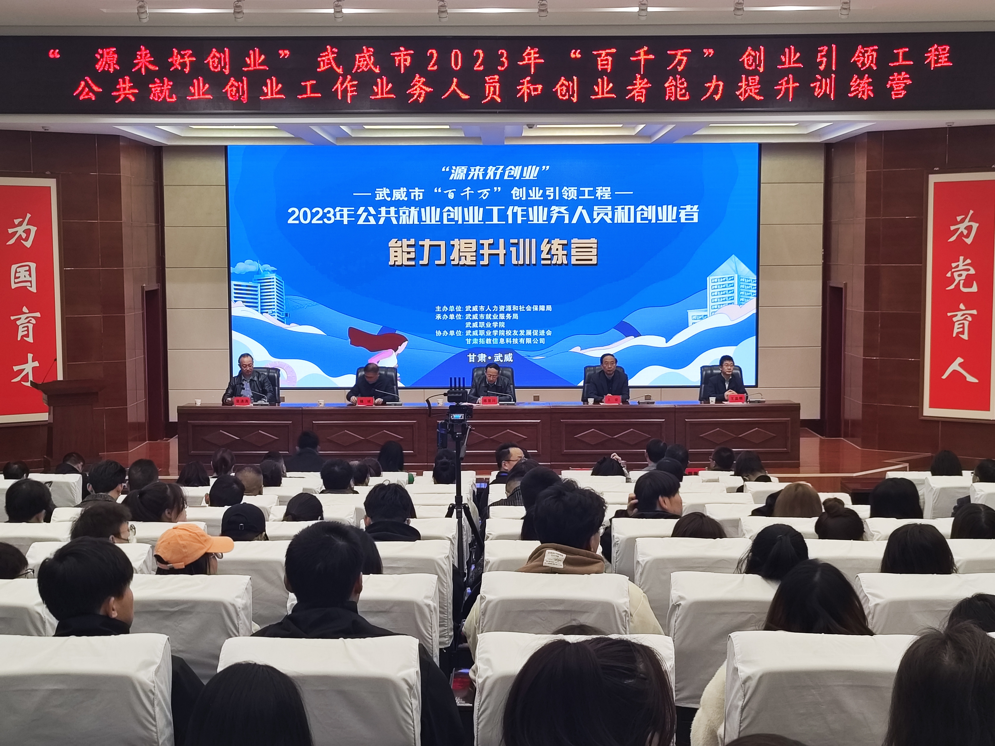 10月24日-26日,由武威市人社局主辦,我校承辦的武威市2023年“百千萬(wàn)”創(chuàng)業(yè)引領(lǐng)工程就業(yè)創(chuàng)業(yè)能力提升訓(xùn)練營(yíng)在菁英廳成功舉辦,武威市人社局黨組書記,局長(zhǎng)陳昱川,市人社局黨組成員,市就業(yè)局局長(zhǎng)魏斌,學(xué)校黨委書記王宏出席了開(kāi)營(yíng)儀式。來(lái)自縣區(qū)就業(yè)創(chuàng)業(yè)指導(dǎo)中心負(fù)責(zé)人,分管就業(yè)創(chuàng)業(yè)工作的領(lǐng)導(dǎo),就業(yè)創(chuàng)業(yè)工作業(yè)務(wù)骨干,我校學(xué)生代表共200人參加訓(xùn)練營(yíng)活動(dòng)。