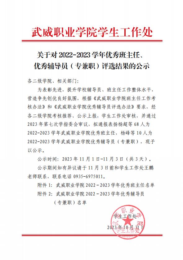 關(guān)于對(duì)2022-2023學(xué)年優(yōu)秀班主任、優(yōu)秀輔導(dǎo)員(專兼職)評(píng)選結(jié)果的公示