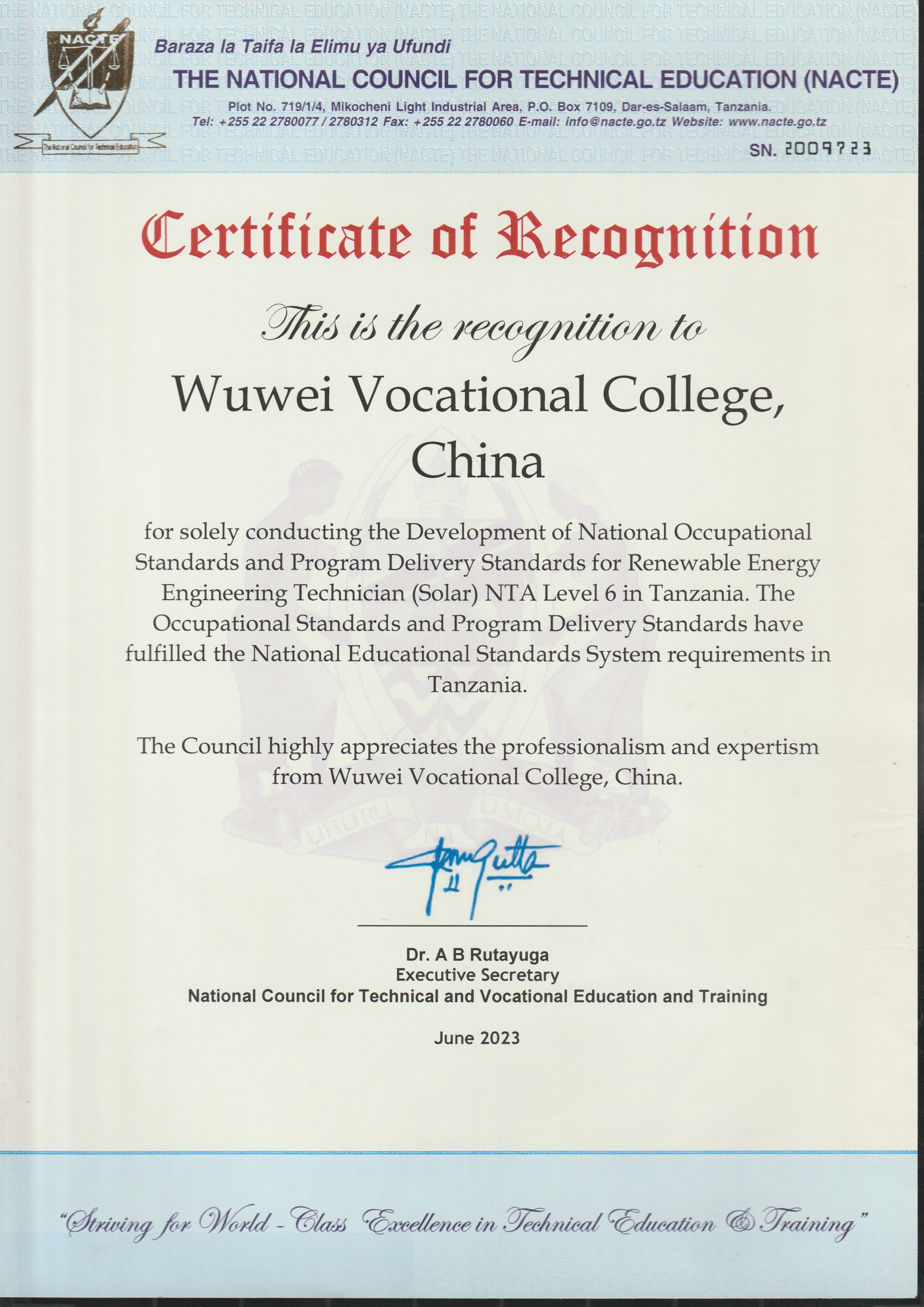 新能源工程技術(shù)員(太陽能)6級職業(yè)標(biāo)準(zhǔn)和配套專業(yè)教學(xué)標(biāo)準(zhǔn)通過坦桑尼亞國家職業(yè)教育委員會審核獲得認(rèn)證