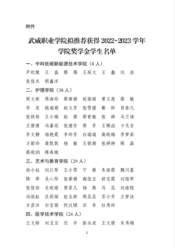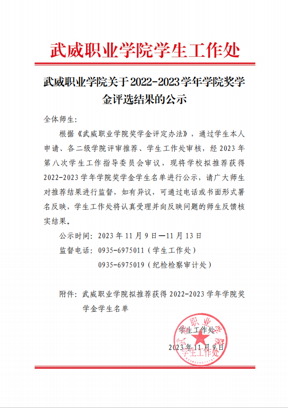 武威職業(yè)學院關(guān)于2022-2023學年學院獎學金評選結(jié)果的公示