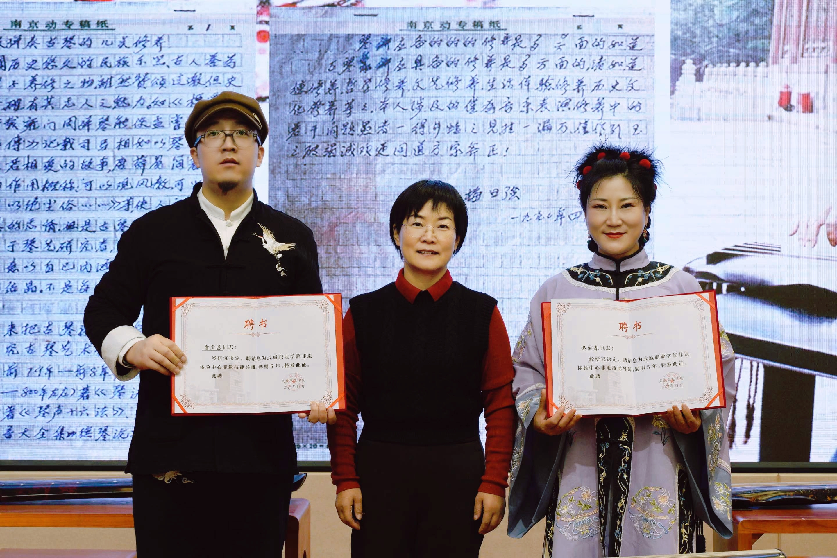 學(xué)院黨委委員、副校長何毅為霍宏昌老師和馮國春老師頒發(fā)學(xué)校非遺導(dǎo)師聘書,霍宏昌老師向?qū)W院傳統(tǒng)文化體驗中心、非遺體驗中心贈送古琴。中國古琴音樂是一門具有深厚歷史文化背景的藝術(shù),它以多重美的高雅品質(zhì),引人無限向往和追求。通過此次活動,旨在吸引更多的師生關(guān)注和傳承好中華優(yōu)秀傳統(tǒng)文化。