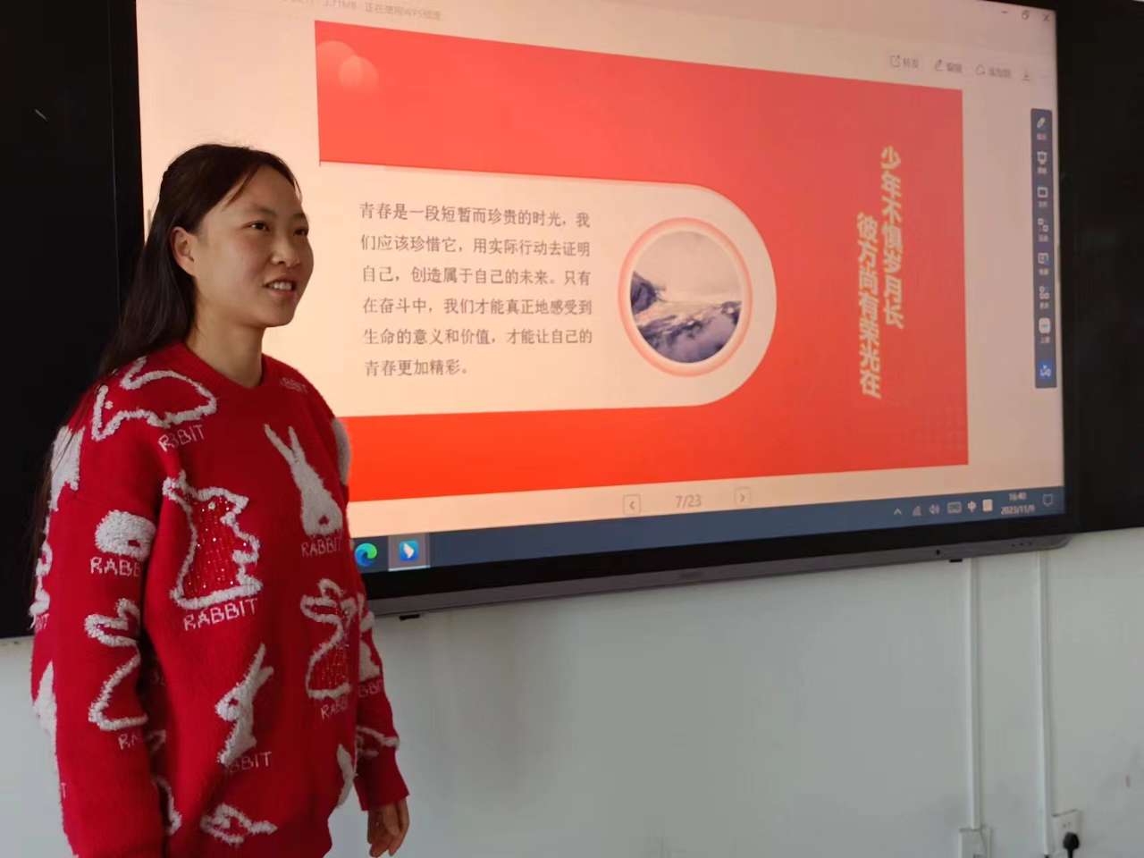 藝術(shù)與教育學(xué)院2021級(jí)學(xué)生后麗婷分享了自己參加“三下鄉(xiāng)”社會(huì)實(shí)踐服務(wù)團(tuán)隊(duì),走進(jìn)基層社區(qū)開展志愿服務(wù)活動(dòng),在基層體悟中不斷增強(qiáng)責(zé)任感和使命感,在社會(huì)課堂中“受教育、長(zhǎng)才干、作貢獻(xiàn)”的事跡。她期盼各位學(xué)子做新時(shí)代好青年,如螢火一般,有一分熱便發(fā)一分光,以?shī)^斗來(lái)點(diǎn)亮青春最亮麗的底色。